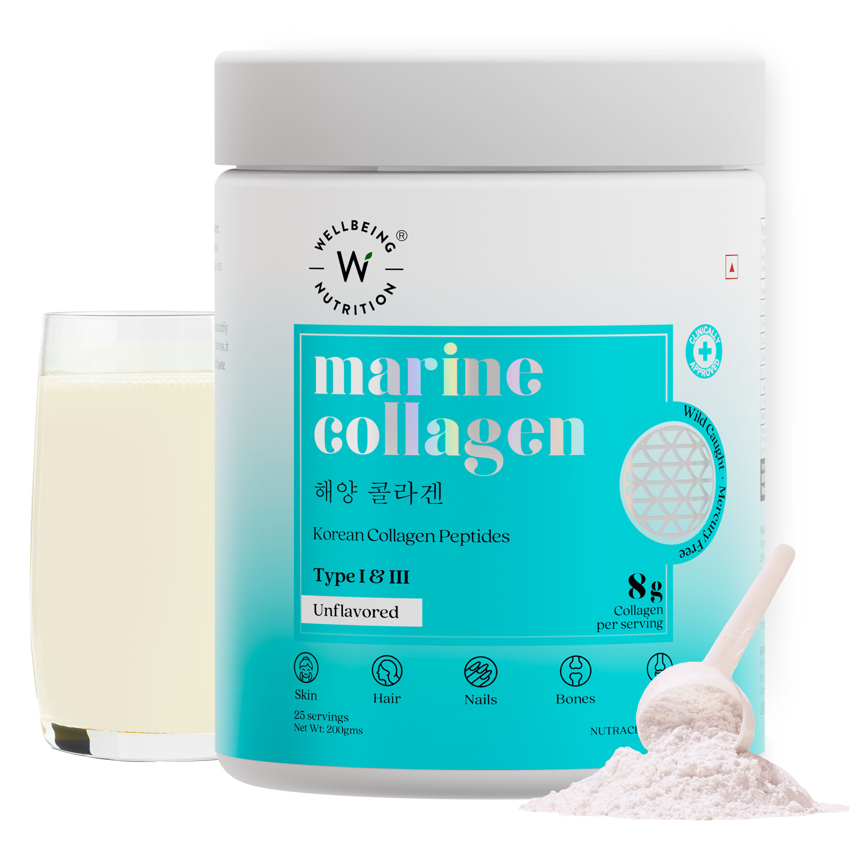 Wellbeing Nutrition 100% Pure Korean Marine Collagen Peptides is a Patented and Scientifically researched collagen protein with a complete Amino Acid profile. Our potent & powerful anti-aging solution protects and enhances your body’s collagen structure. This advanced Nano Science formula contains pure 8000 mg of Premium Wild Caught Marine Collagen from Korea hydrolyzed to an advanced low molecular weight of 3000 Daltons which makes it the purest form of collagen on earth for 100% bioavailability and absorption- designed to regenerate & renew firm youthful skin, grow healthy hair & nails and strengthen joints, muscles & bones. Wellbeing Collagen will give you Youthful, Smooth & Supple Skin, Reduced Wrinkles and Fine Lines, Increased Firmness & Elasticity, Deeply Hydrated Skin, Reduced Under Eye Dark Circles, Acne, Blemishes & Pigmentation, Improved Follicle Strength & Increased Keratin Production for Radiant Hair, Improved Gut Health For Clear Glowing Skin and Strong Joints, Muscles & Bones in a single 8G scoop per day.