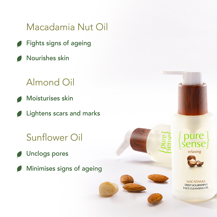 Indulge yourself in a unique routine of cleansing with this luxurious, rich cleansing oil. It effortlessly glides in your skin and helps to gently remove makeup as well as other impurities from your pores. Infused with luxurious oils, this cleansing oil seeps into your skin and gives you long lasting hydration. Its warm aroma instantly calms your senses and the nutty goodness ensures your skin always looks healthy. Formulated with the goodness of ethically-sourced Macadamia Nut Oil from Australia, it is rich in Vitamin C, Vitamin A, Oleic Acid, and other essential fatty acids to nourish your skin, without clogging the pores. This cleansing oil is also infused with exotic oils like Almond and Sunflower Oil. All these three oils work harmoniously to moisturise your skin, minimise signs of ageing, as well as heals marks and scars. This cleansing oil works effectively to remove makeup and cleanse your skin in a single swipe.