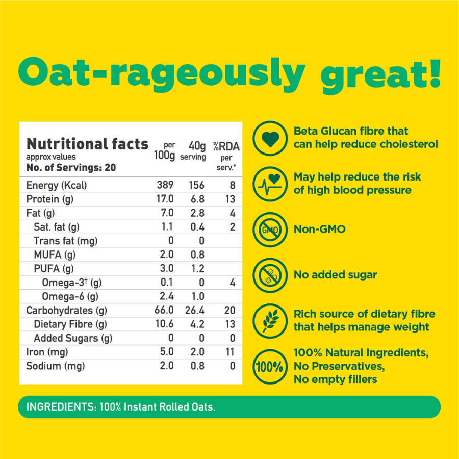 Forget everything you know about Oats. Yogabar Quick Cooking Super Oats is different. This is Oats - like never before. That's why we call it golden instant oats. No Fillers, no preservatives, nothing artificial. Great for your Heart, great for weight management. We can go on, but we're running out of space. Pick us up? You're going for gold. Why Choose Yogabar 100% Golden Rolled Oats? Certified Premium Gluten Free Oats. High Fibre, No Added Sugar, 100% Wholegrains. The goodness of rolled oats - a rich source of protein, dietary fibre and vitamins & minerals. Preparation Time: With a mere preparation time of 2 minutes, YogaBars instant oats are ideal for a quick wholesome meal! Yogabar Oats Contains Beta Glucan fibre that may help reduce Cholesterol.