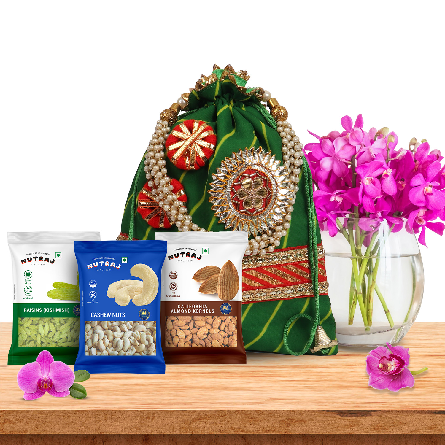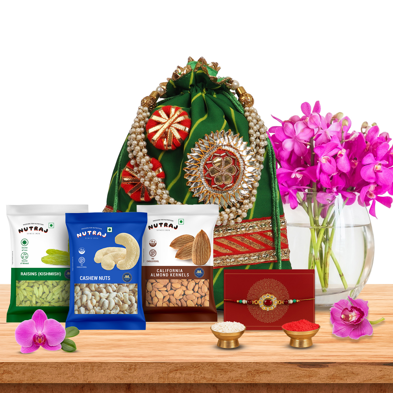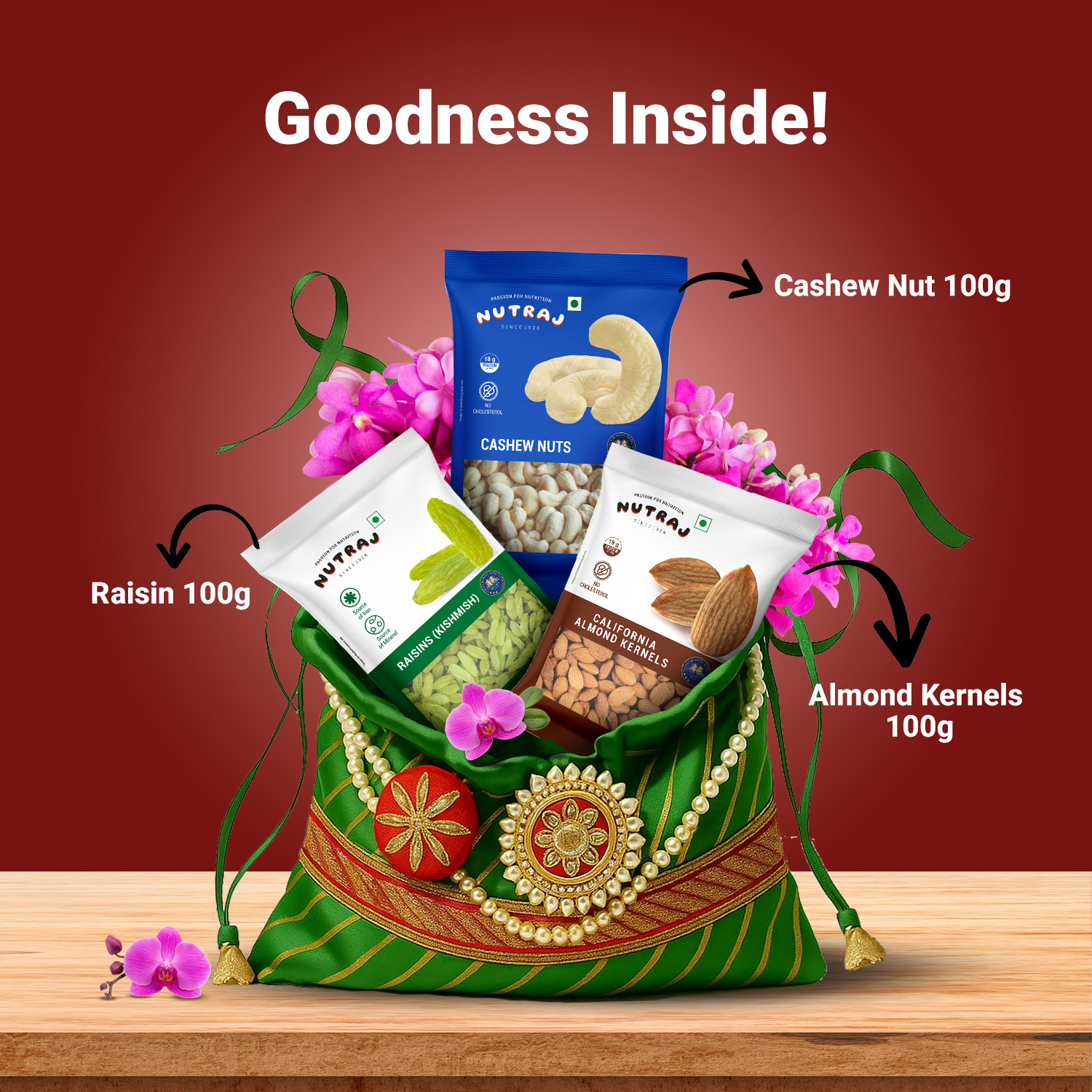 Each Nutraj Potli comes with nutritious delights and a traditional Rakhi, tilak, and chawal, symbolizing your bond for a memorable Raksha Bandhan gift that blends health, taste, and tradition.