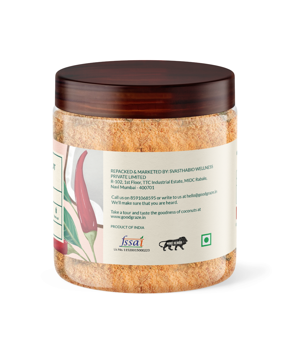 Good Graze Red Coconut Chutney is a mix which is an on the go premix that can be used anytime anywhere. All it needs is just water and the chutney is ready to serve. All natural ingredients.