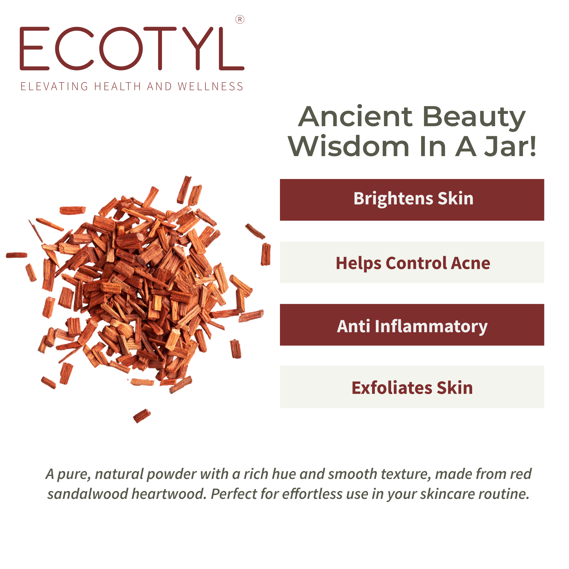 Traditionally used in Ayurvedic skincare, Red Sandalwood helps tackle acne, reduce pigmentation, soothe sunburns, and bring out your skins natural glow without the use of any chemicals or artificial additives. Whether you're dealing with dullness, breakouts, or uneven tone, Ecotyl brings you a heritage ingredient that restores skin health naturally.