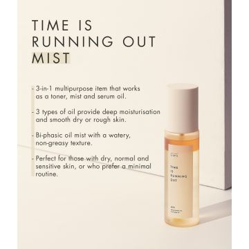 2. Time Is Running Out Mist - 30ml - A 3-in-1 multipurpose item that works as a toner, mist, and serum oil. The mist uses 3 types of oil to provide deep moisturisation and smooth dry or rough skin. It is a biphasic (oil-water) mist with a watery, non-greasy texture.