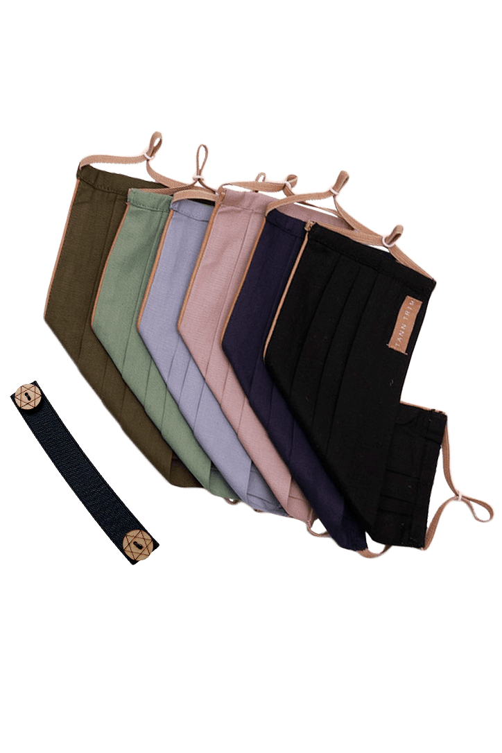This product is made with 100% premium cotton, hand-crafted, breathable and reusable with signature details of tann colour piping and high quality elastic. It comes with a nose adjuster as well as with an elastic adjuster to give a comfortable fit. Also, this set of 6 comes in greyish blue, sage green, olive green, navy blue, black and lavender, with elastic neckband. Pair this mask with our detachable mask chain. These made in properly sanitized production setups with artisans daily checked with temperature and proper treatment to avoid any kind of medical issues.