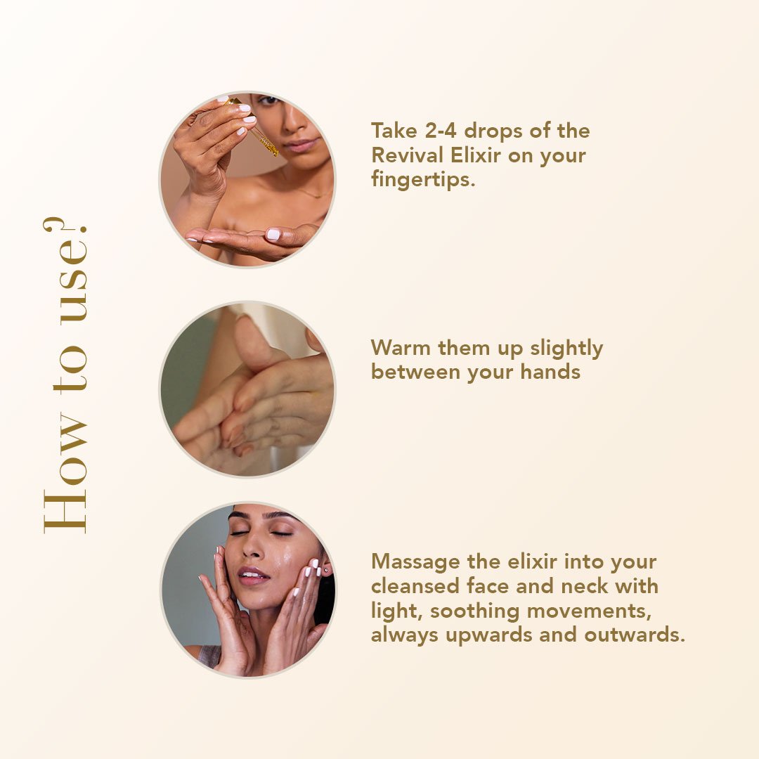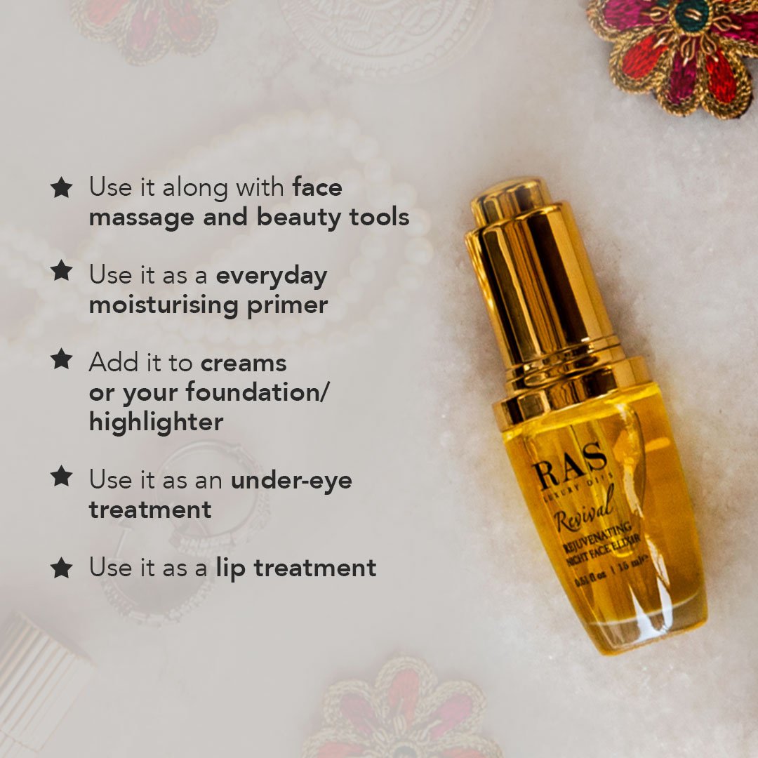 Your skin works hard to repair itself while you sleep and our Revival Rejuvenating Night Face Elixir helps it regenerate even better. An exquisite concoction of botanical oils with a nourishing yet lightweight texture, the elixir heals your skin from within. Our elixir is rich in Vitamins A & E and is the perfect blend for those with normal, dry and dehydrated skin