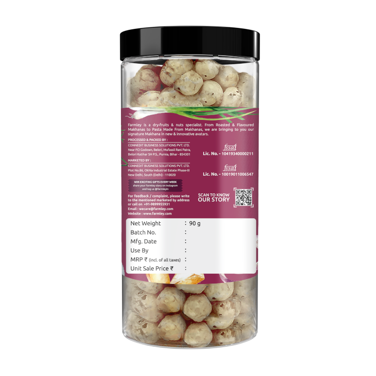Rich in nutrients and antioxidants, supports blood sugar levels, weight loss, and anti-aging properties and promotes heart health. Popular snack items, rich in good carbohydrates and proteins, Fun party snack, Healthy namkeen. About 90% of the world's makhana produce comes from Bihar, farmley Makhanas come directly from ponds of Bihar that are 100% naturally sourced, giving you the best quality and adulteration free products. Screw type packing with easy open metal lid to maintain the freshness and crunchiness for long time. Also available in flavors: Peri peri, Tangy tomato, Himalayan salted, Minty pudina Products will be shipped on 9th Jan.