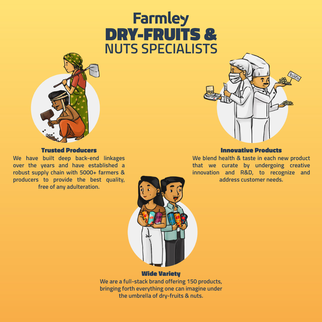 Direct from farm: Farmley sources all nuts and dry fruits directly from farms, hygienically packing them in an HACCP certified unit.Full of taste: It's an upgrade over traditional unflavored makhana and other unhealthy snacks!