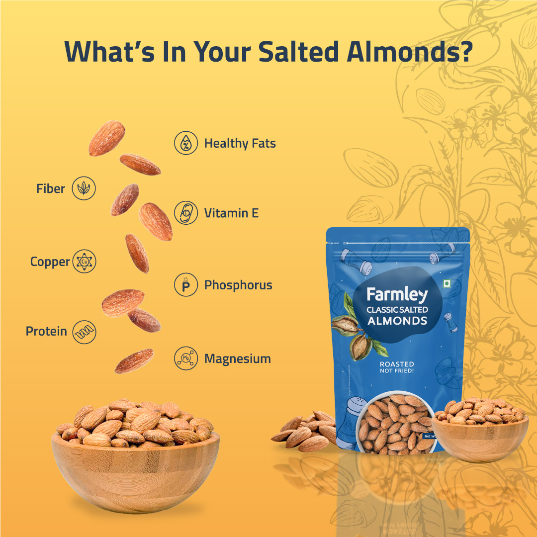 - Roasted, Not Fried: Unlike the other snacking options, that are fried in Palm Oil, Farmley Almonds are roasted & not fried.