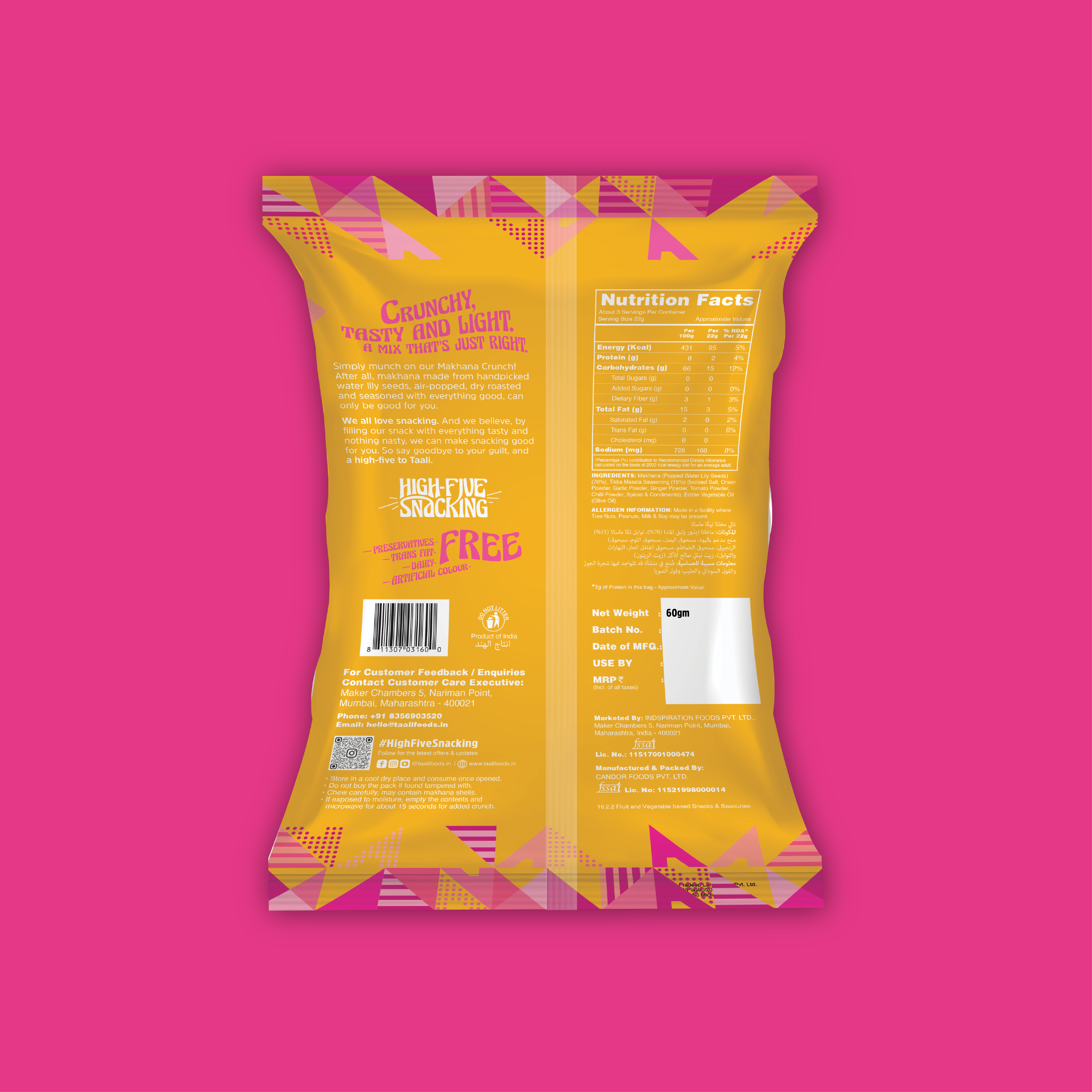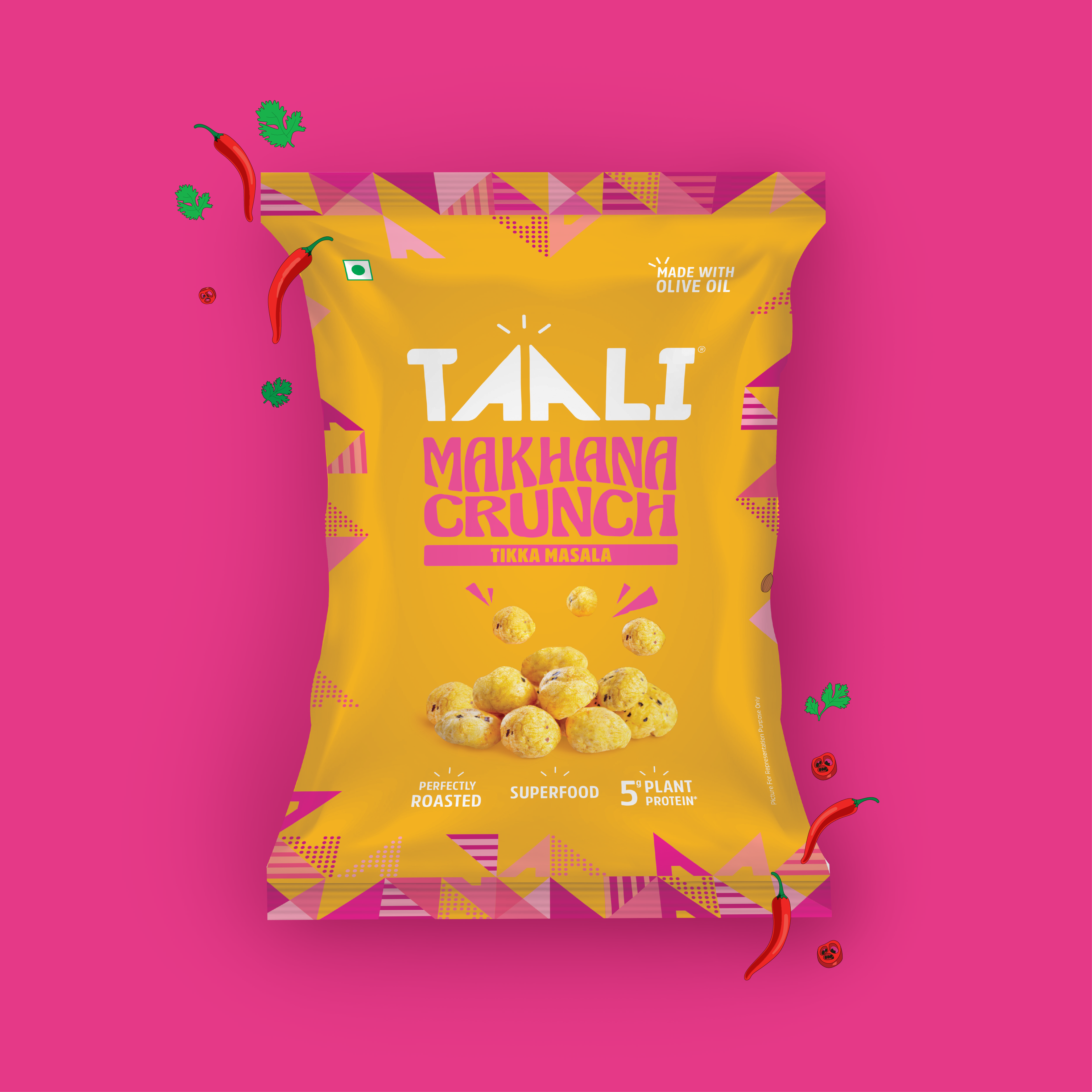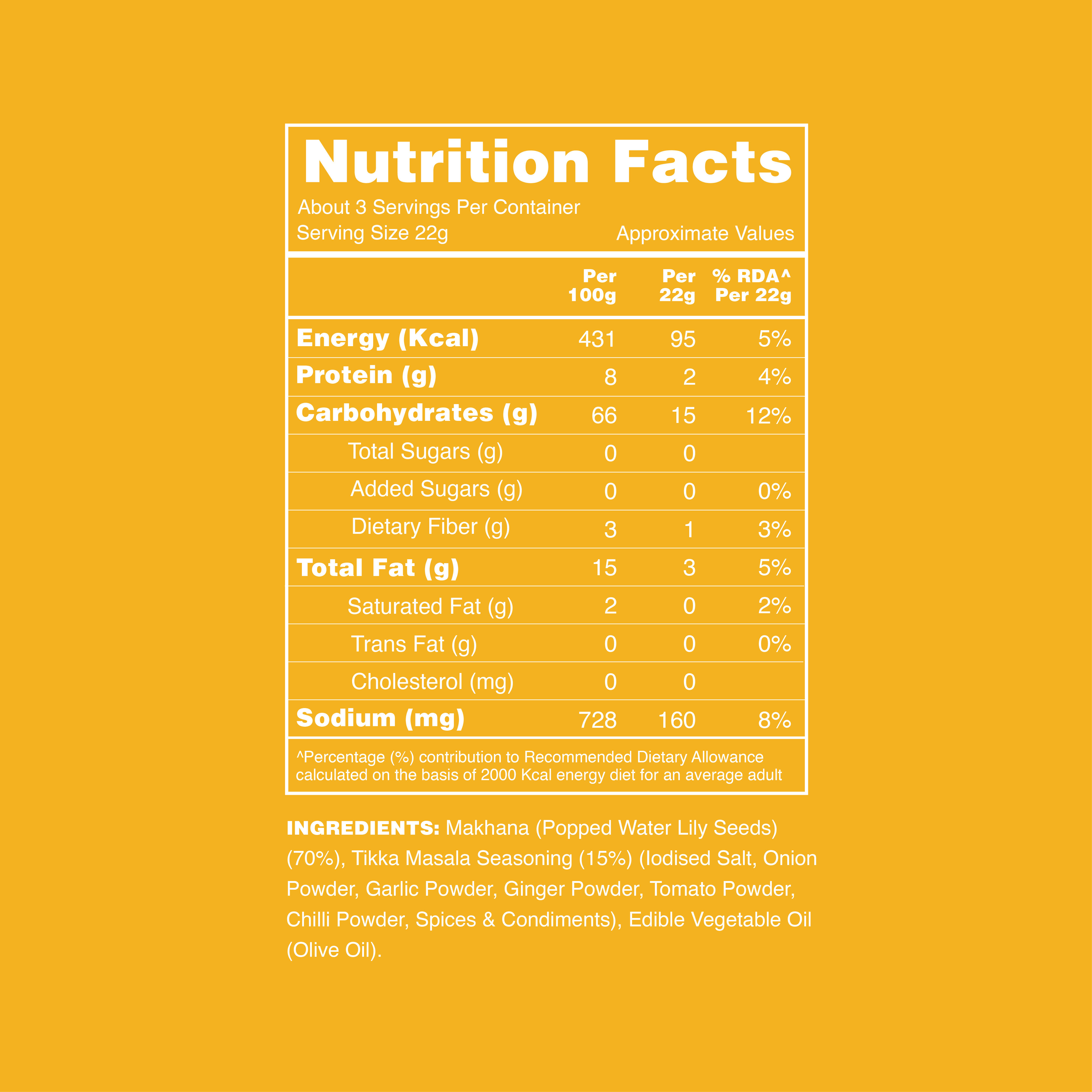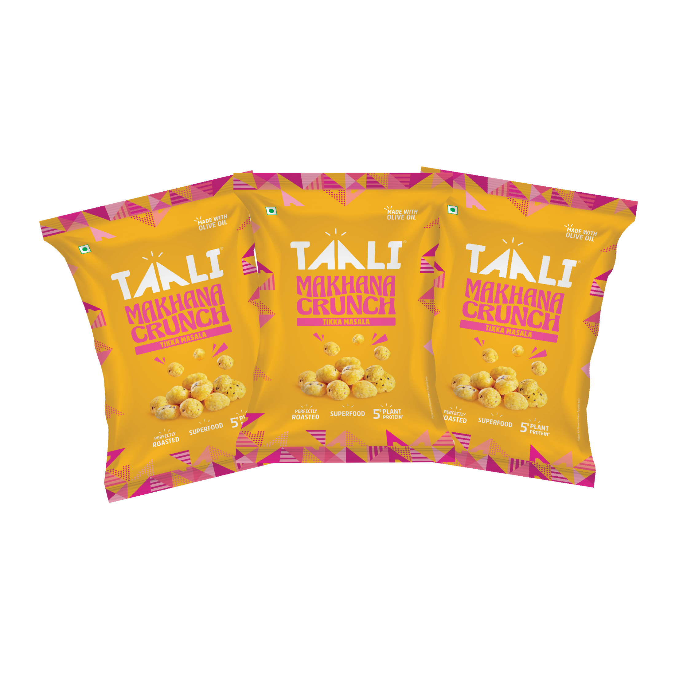 Taali Roasted Makhana Tikka Masala is a deliciously spicy and tangy snack made with roasted fox nuts (makhanas) and seasoned with a variety of aromatic spices. These crunchy makhanas are vegan, gluten-free, and packed with plant protein to help offer a guilt-free snack option for tea breaks, picnics, or on-the-go munching. They are not fried, rich in nutrients, and can be an ideal snack alternative.