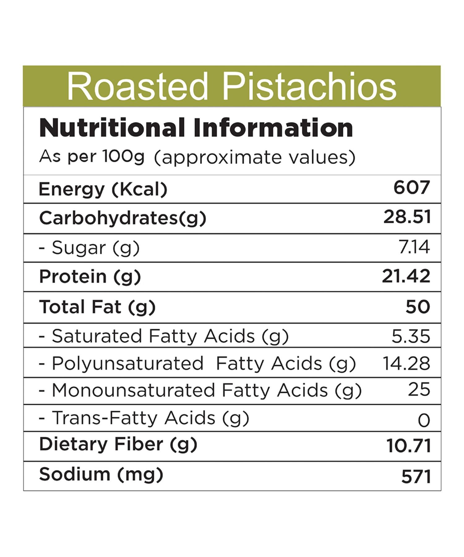 This product is a roasted californian pistachio without oil in iodized salt and is highly rich in dietary fibre, energy, protein.