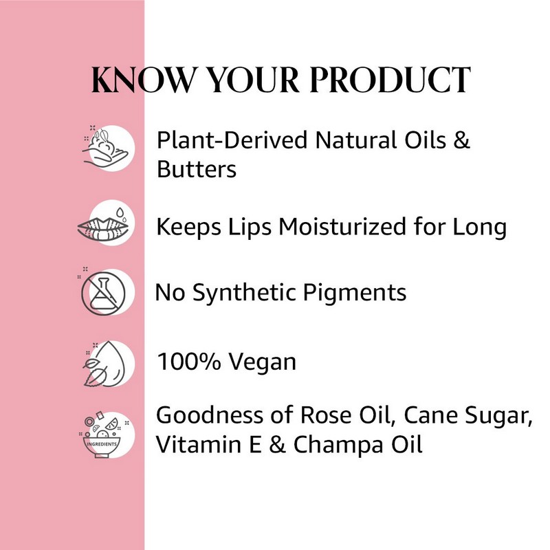 Experience the lusciousness of the all-new Indian Rose Lip Balm with the essence of wild rose petals to smoothen your chapped lips. This Rose lip balm has been made with the luxuriousness of essential Ayurvedic elements like Wild Rose Extract, Rose Oil, Champa Oil, Shea Butter, Cocoa Butter, Kokum Butter, Castor Oil, Almond Oil, Wheat Germ Oil, Candelilla Wax and Turmeric Oil . This product hydrates your lips and gives them a youthful look. Made with extra care, this lip balm for pink lips removes dryness, nourishes, softens and lightens your lips naturally. Enjoy the wellness of this luxurious Rose lip balm and get the perfect, nourshed pink lips everyday.