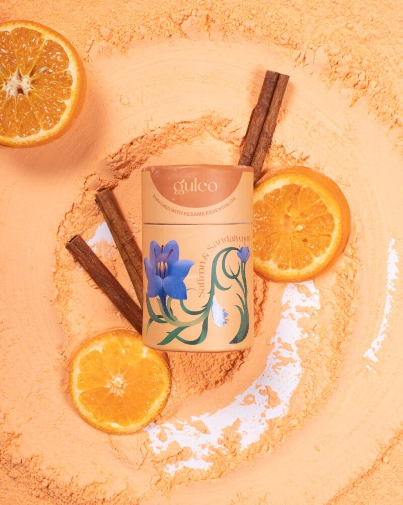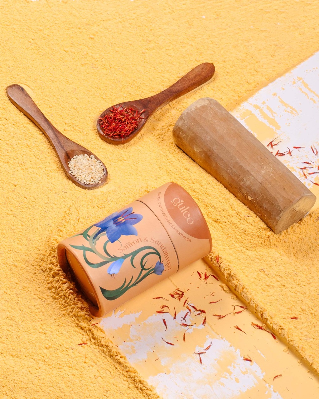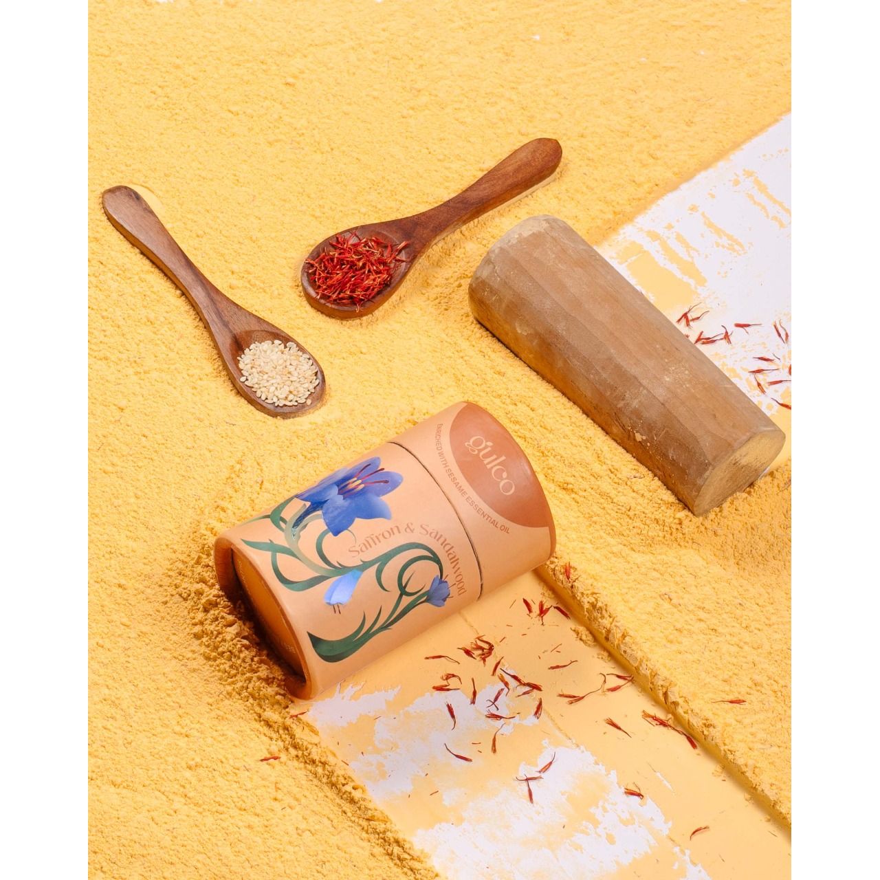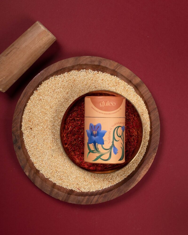 Saffron and sandalwood gulal enriched with sesame essential oil, real saffron threads & sandalwood powder The ancient secret for radiating and glowing skin. Kesar gives a warm glowing complexion. Chandan is revered in ayurveda for its antiseptic, toning, purifying, cooling and soothing properties. Sesame oil makes the skin supple, soft and toned