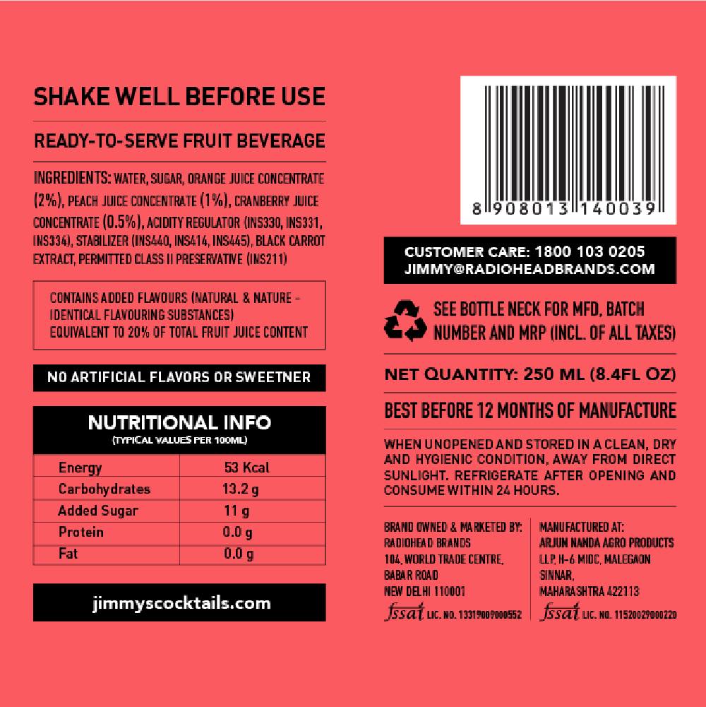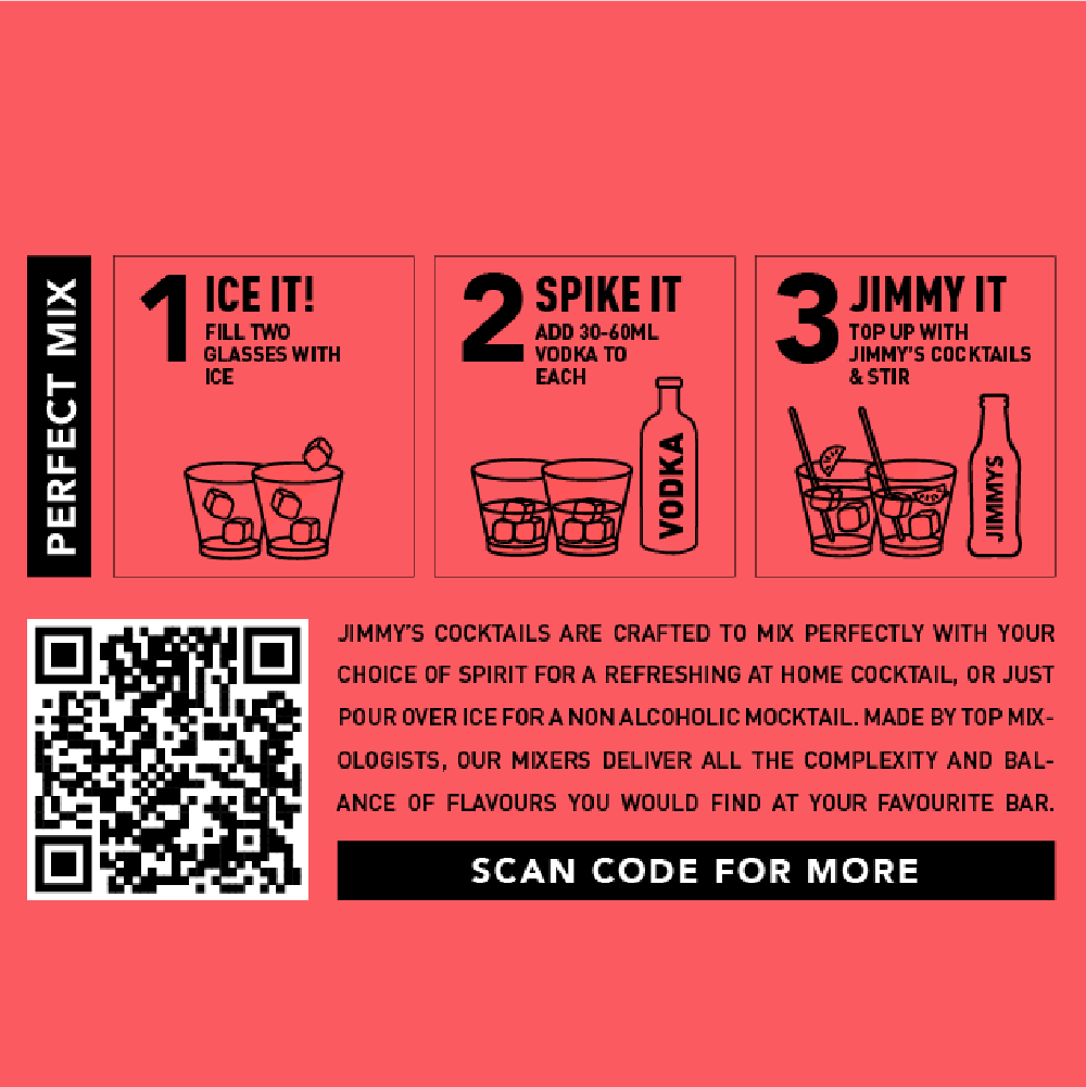 Jimmys Sex On The Beach is a tropical blend of the finest Nagpur oranges, Egyptian peach and Danish cranberry with a dash of triple sec. Finely crafted and infused with natural flavours, Jimmy's provides a convenient & consistent solution for serving a delicious SOB cocktail.