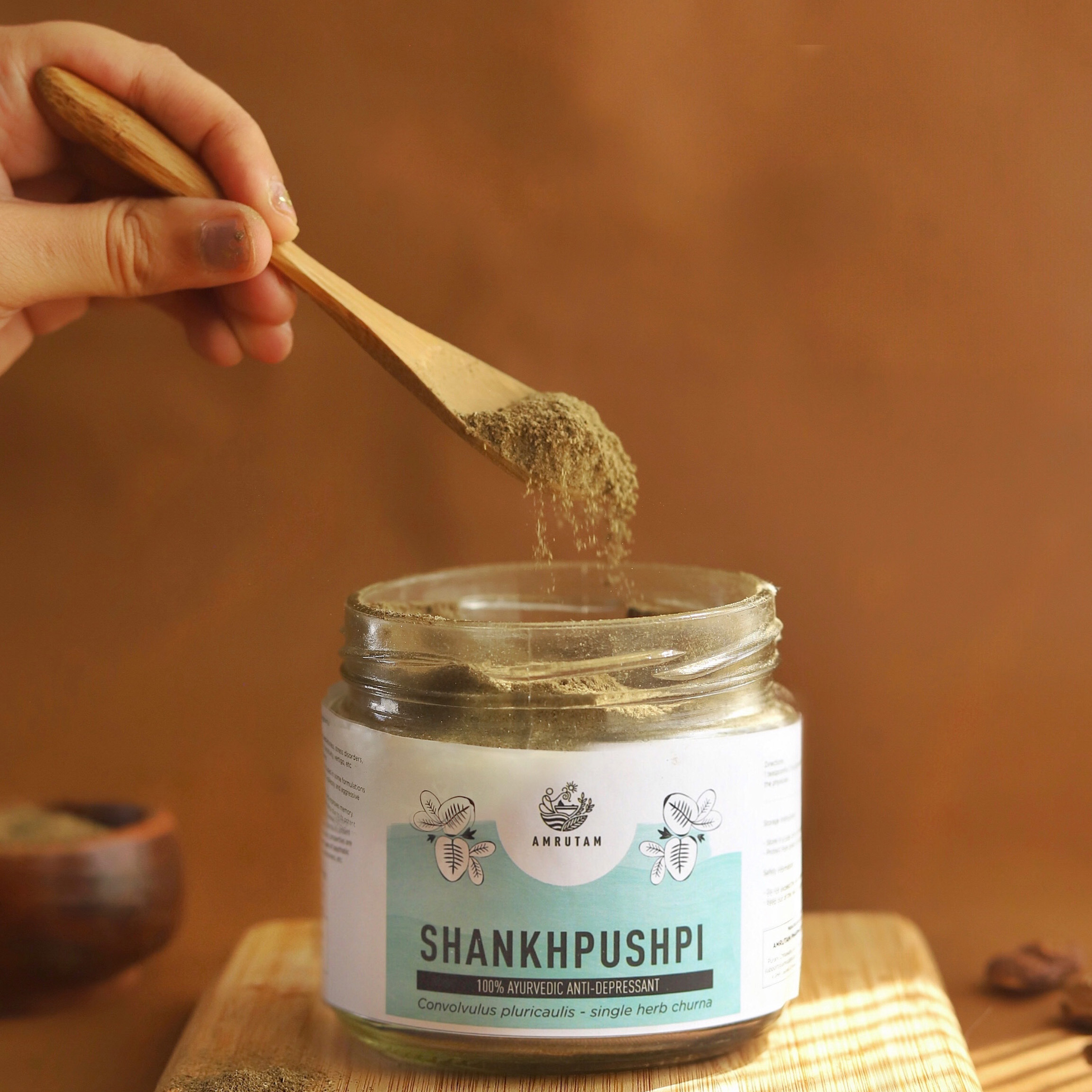 Amrutams Shankhpushpi Churna holds great significance for its potent anti-stress, antidepressant and anti-anxiety properties. Made with a mixture of powdered herbs, Shankhpushpi Churna, an Ayurvedic antidepressant churna is extremely useful in treating different types of psychotic problems like depression, dementia, restlessness, insomnia, stress disorders, mental debility, anxiety sensitivity and vertigo. The churna for mental health can also help treat schizophrenia, epilepsy and aggressive behaviour disorders. It is a brain tonic that improves memory.