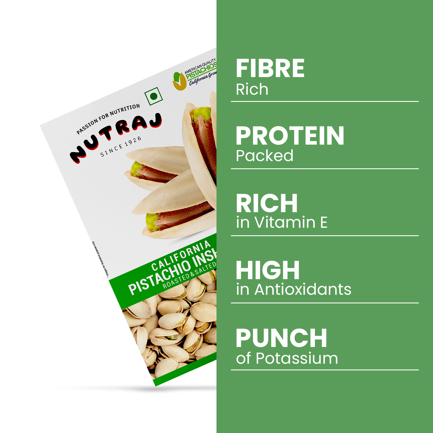 Coated beautifully in the purple-green colour, Nutraj Signature Roasted and Salted California Pistachios are packed with essential vitamins, minerals and antioxidants. The subtle salty flavour and crunchy texture has made this pack of pistachios worth the desire. Pistachios are a good source of dietary fiber, vitamin B 6, thiamine, phosphorus and copper that adds more to its goodness. Let them add more to your diet than mere taste and colour. Soak in the love of Nutraj Pistachios and let its yearning fill you up. Disclaimer: This item is vacuum packed to retain the freshness and crispiness of the product inside. Nutraj is a pioneer name in the trade of healthy bites, and offers the finest variety of nuts and dried fruits from around the world. Process, hygiene and quality are the major parameters which are laid major emphasis on under this lab.