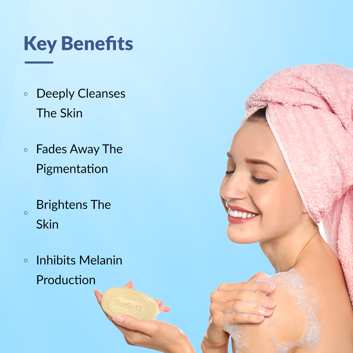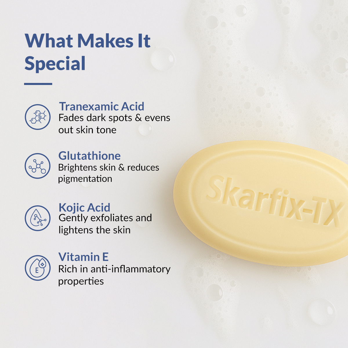 Skarfix-TX Soap is a novel approach to treating pigmentation and brightening skin tone. It combines tranexamic acid, kojic acid, and glutathione to brighten skin, reduce pigmentation, and improve overall complexion, offering a gentle yet effective solution for a radiant complexion.