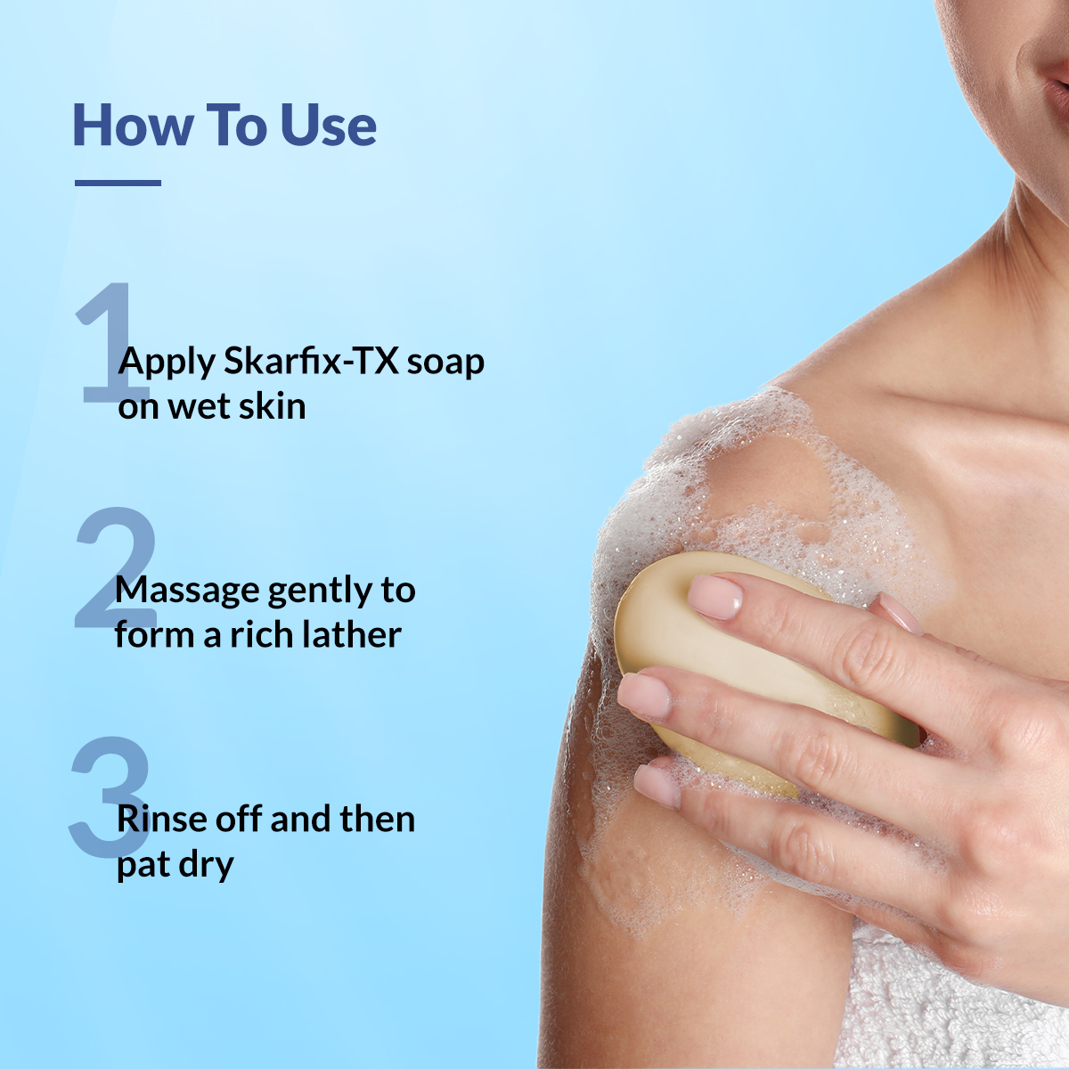 Wet the skin ,massage skarfix-tx soap liberally and make a rich lather ,rinse thoroughly