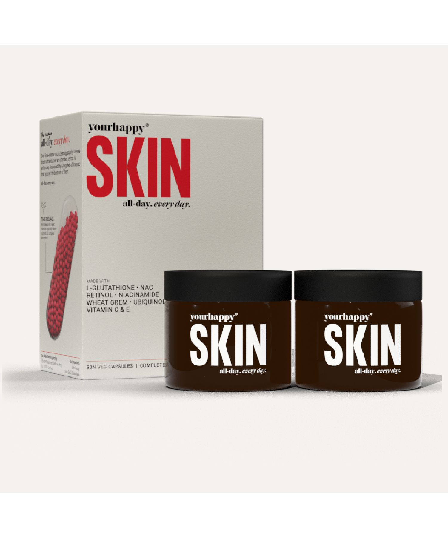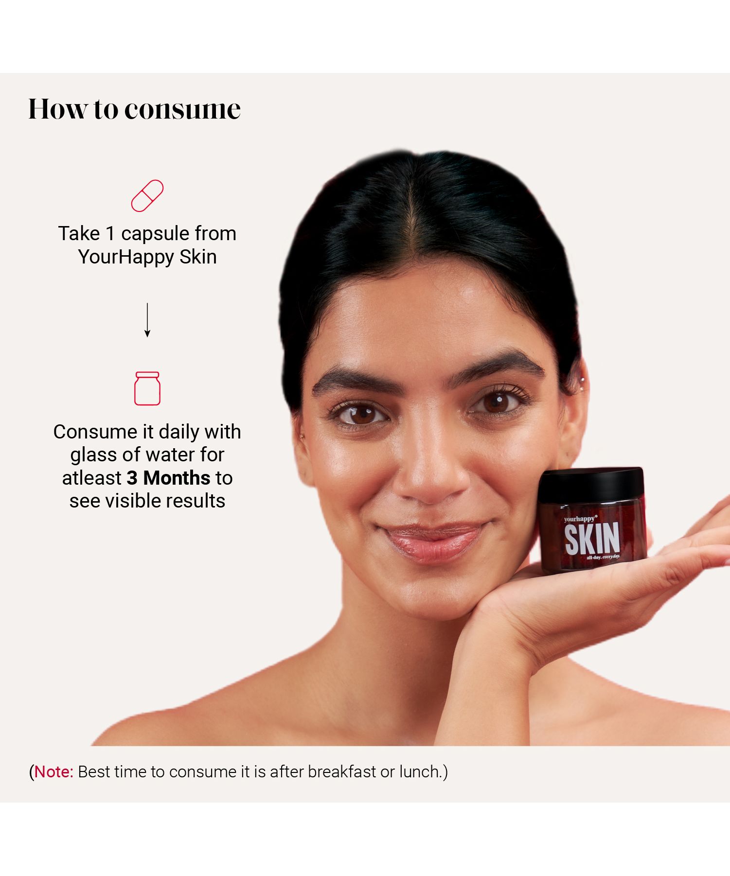 This uniquely reparative formula restores radiance by targeting environmental damage and inflammation on a cellular level. Nourished from the inside out, your skin looks visibly radiant & clearer. Experience the power of YourHappyLife All-Day, Everyday Range. Powered by 325mg Activated L-Glutathione, Niacinamide, Retinol, Lipid Ceramides, Wheat Germ, Ubiquinol(CoQ10), Vitamin C & E for a holistic approach towards radiance & even skin tone.