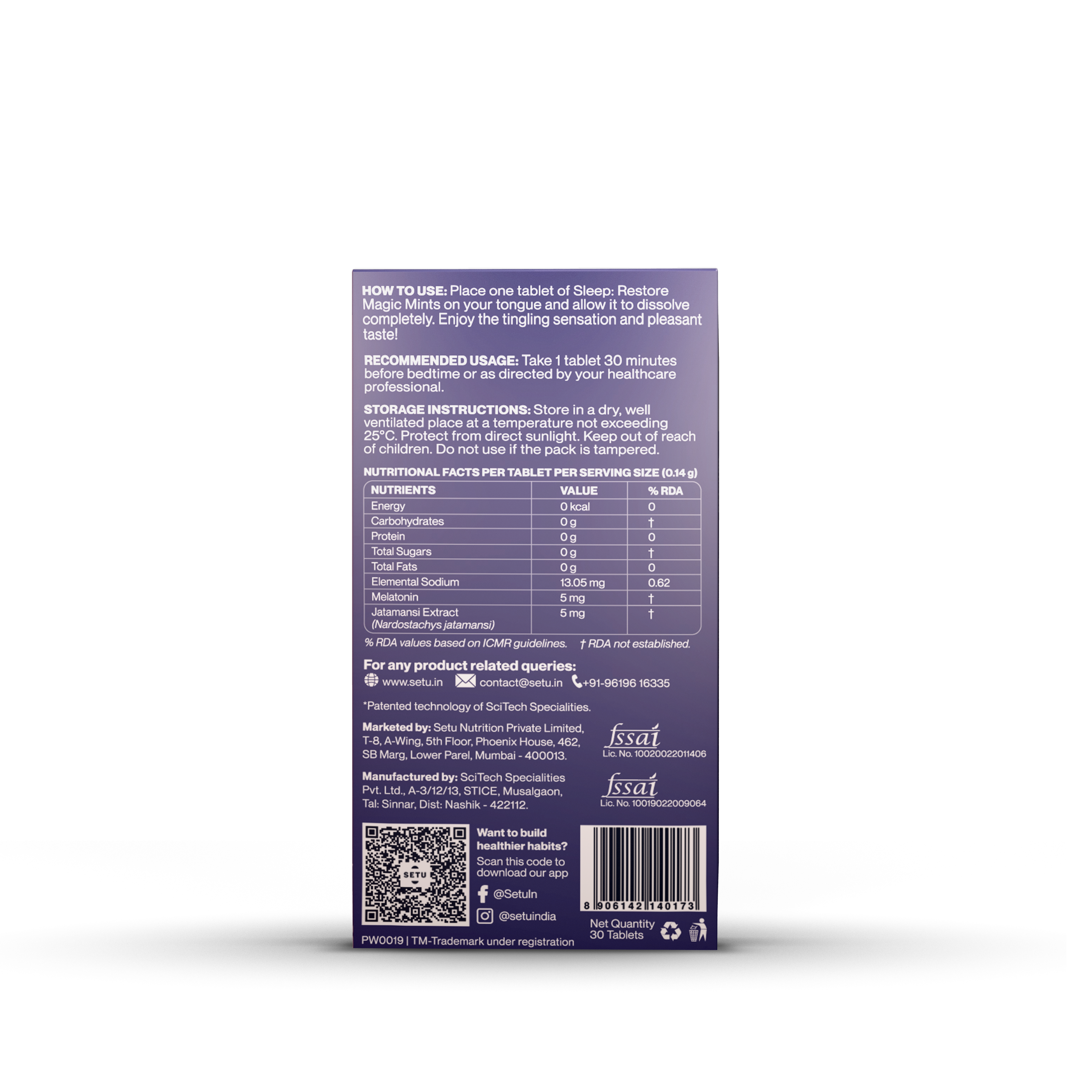 DITCH REGULAR TABLETS FOR TASTY MINTS: Your sleep just got an upgrade with Sleep: Restore Magic Mints that come as small refreshing mints instead of traditional pills & capsules that no one likes taking. Just place one mint on your tongue and let it dissolve. FALL ASLEEP BETTER FASTER & FOR LONGER: Packed with pure melatonin 5 mg (the sleep hormone) and Jatamansi extract (a natural sleep aid Indian herb) our magic mints help to fix the sleep cycle whether you are suffering from jet lag daytime sleepiness disturbed sleeping pattern or generally find it hard to fall/stay asleep.