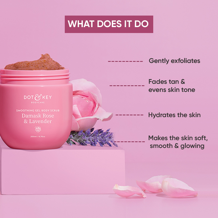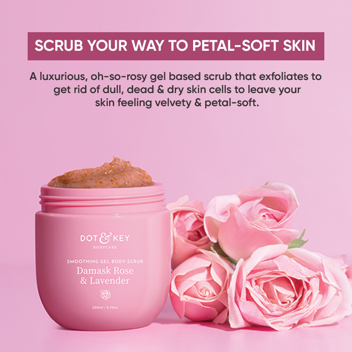 Ready to pamper your skin with this luxurious treat? Lovingly crafted with handpicked Damask roses, a hint of French lavender oil and finely crushed walnut shells, the dewy gel texture of this scrub spreads on the skin like a dream to exfoliate dead skin cells and reveal smooth, petal-soft skin. Indulge in this romantic rosy treat that along with your skin, perks up your senses too. With the unmistakable fragrance of pure Damask Rose that lingers on for hours, it provides a luxurious exfoliation experience.