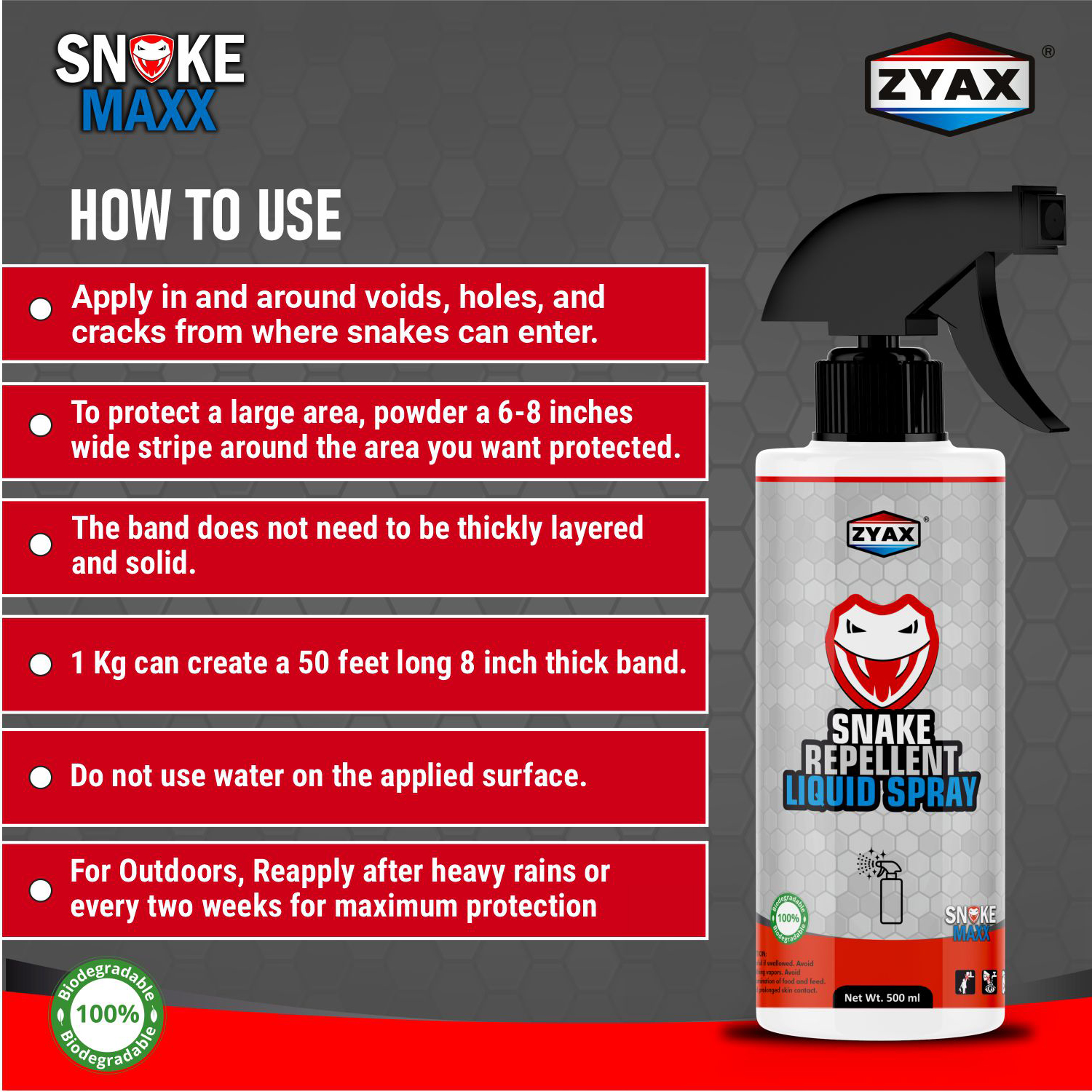 Spray Snake Maxx Repellent Liquid Spray around, into, or next to the area you wish to protect. The product is for outdoor use only, re-apply after heavy rains or every two weeks to obtain best results.