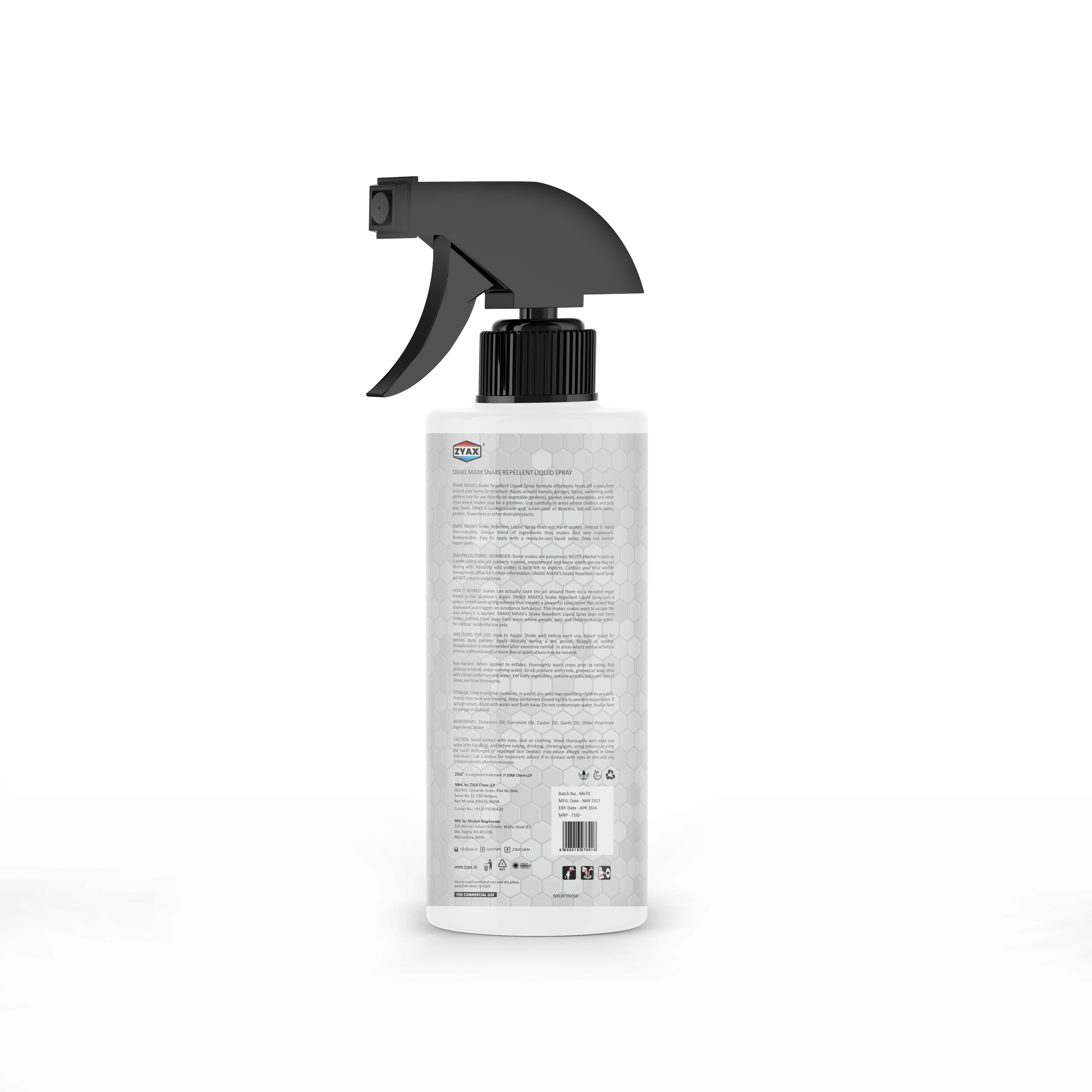 Zyax Snake Maxx Snake Repellent is a specialized solution designed to repel and deter snakes from your surroundings. The formulation of Zyax Snake Maxx is specifically tailored to emit a scent or create a barrier that snakes find unpleasant, deterring them from entering or remaining in treated areas. This repellent spray is designed to work on a variety of snake species, helping to keep them away from your property. While Zyax Snake Maxx is designed to repel snakes, it's worth noting that its effectiveness may vary depending on factors such as the species of snakes in your area, environmental conditions, and the severity of the snake activity. In addition to using a snake repellent, it's important to take measures to minimize attractive features for snakes, such as removing potential food sources, sealing entry points, and keeping outdoor areas well-maintained.