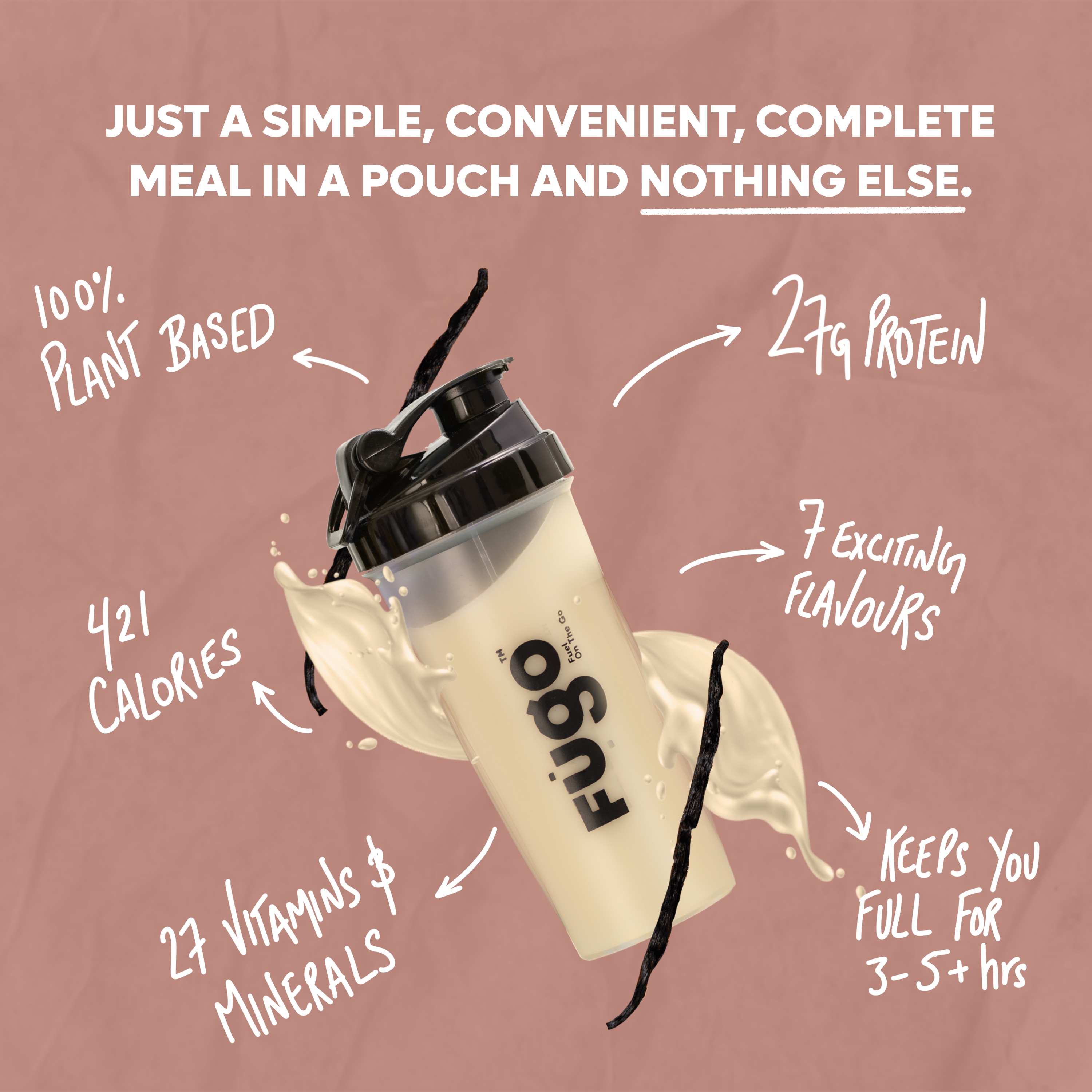 Simple, Convenient & Delicious - A delicious meal in a simple convenient meal-shake. An entire meal in a single convenient pouch. Each meal fuels you up to 5+ hours with 27 vitamins & minerals, 27g of protein, essential fats & fibres and all the necessary nutrients of a healthy & balanced meal. Forget having to cook and clean messy dishes. Fugos meals are perfect for those looking to save time. You can prepare Fugo in under 30 seconds with minimal cleanup. And the best part? You can always have it on the go - saving those precious minutes that can make a difference!