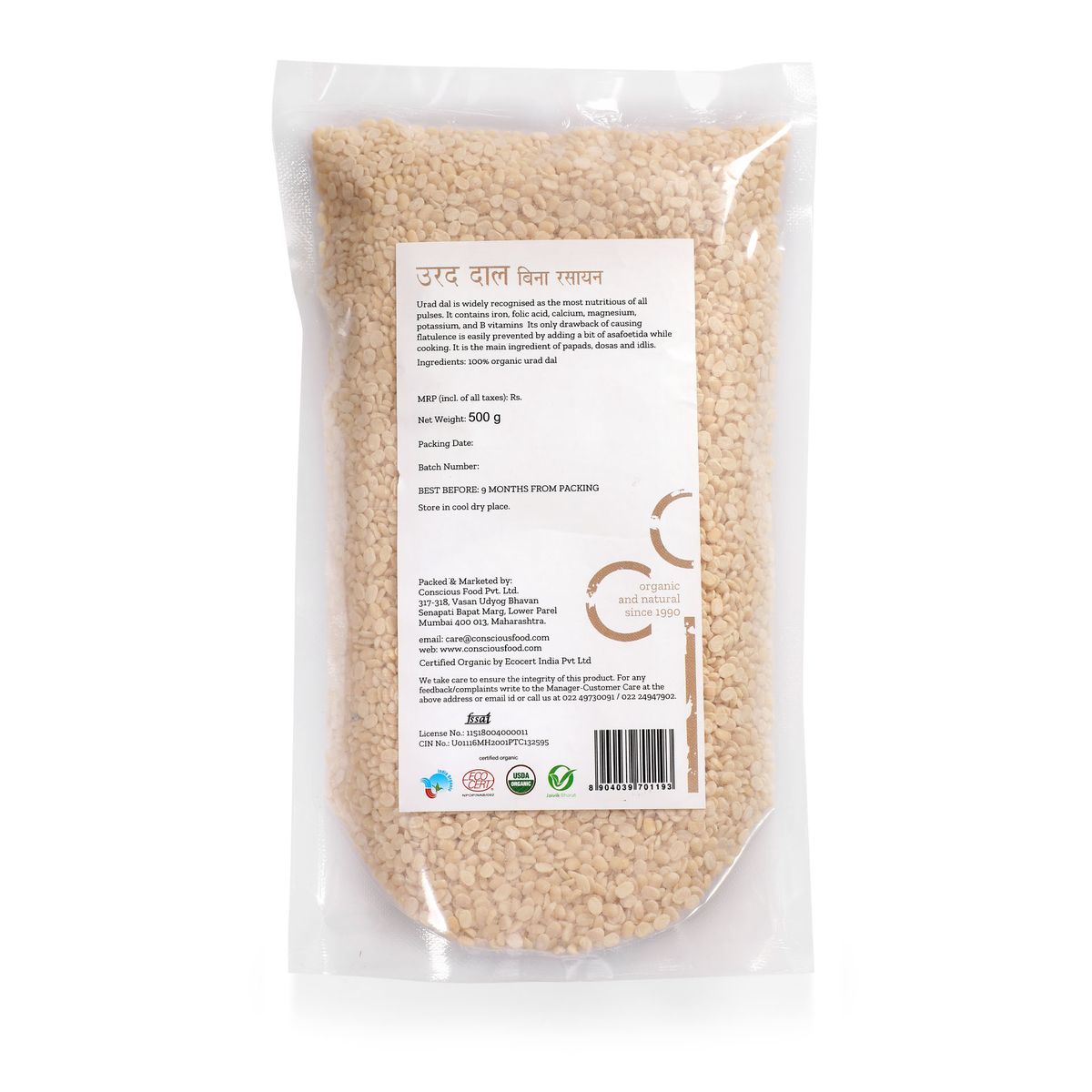 Called masha in Sanskrit, urad dal is cooling and the most nutritious of all pulses. Its only drawback of causing flatulence is easily prevented by adding a pinch of our asafoetida while cooking it. It is the main ingredient in papads and idlis and is a staple part of North Indian cooking (used to make dals, soups and khichdis). Our organic urad dal is wholesome, nutrient-dense and easy to digest. It comprises probiotic fibre that promotes growth of beneficial microorganisms in the intestines. It is a low glycemic index therefore regulating blood sugar and insulin levels for people worried about type II diabetes and is also abundant in calcium and Vitamin B.