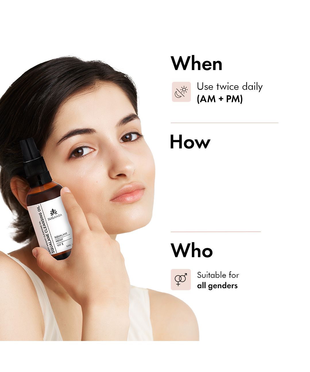Suganda Squalane Cleansing Oil is a light cleansing oil that effortlessly dissolves surface impurities and makeup without leaving your skin feeling greasy. Formulated with carefully selected oils, it won't clog your pores. This cleansing oil leaves your skin feeling soft and moisturized. Infused with squalane, it softens the skin and keeps it nourished. This oil is suitable for all skin types including oily skin.