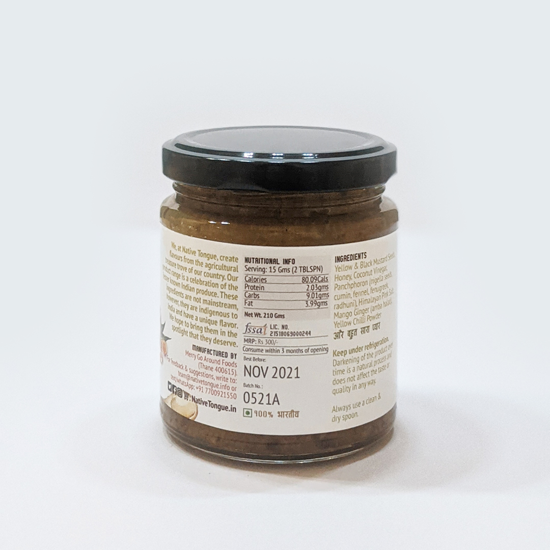 Our stone-ground mustard with amba halad or mango ginger is an ode to the traditional Bengali relish Kashundi. An eastern Indian spice blend called panchphoron, along with turmeric notes of mango ginger and a sharp kick from yellow chilli add a complex depth of flavour. The sourness from cashew vinegar and sweetness from honey tie the relish together.
