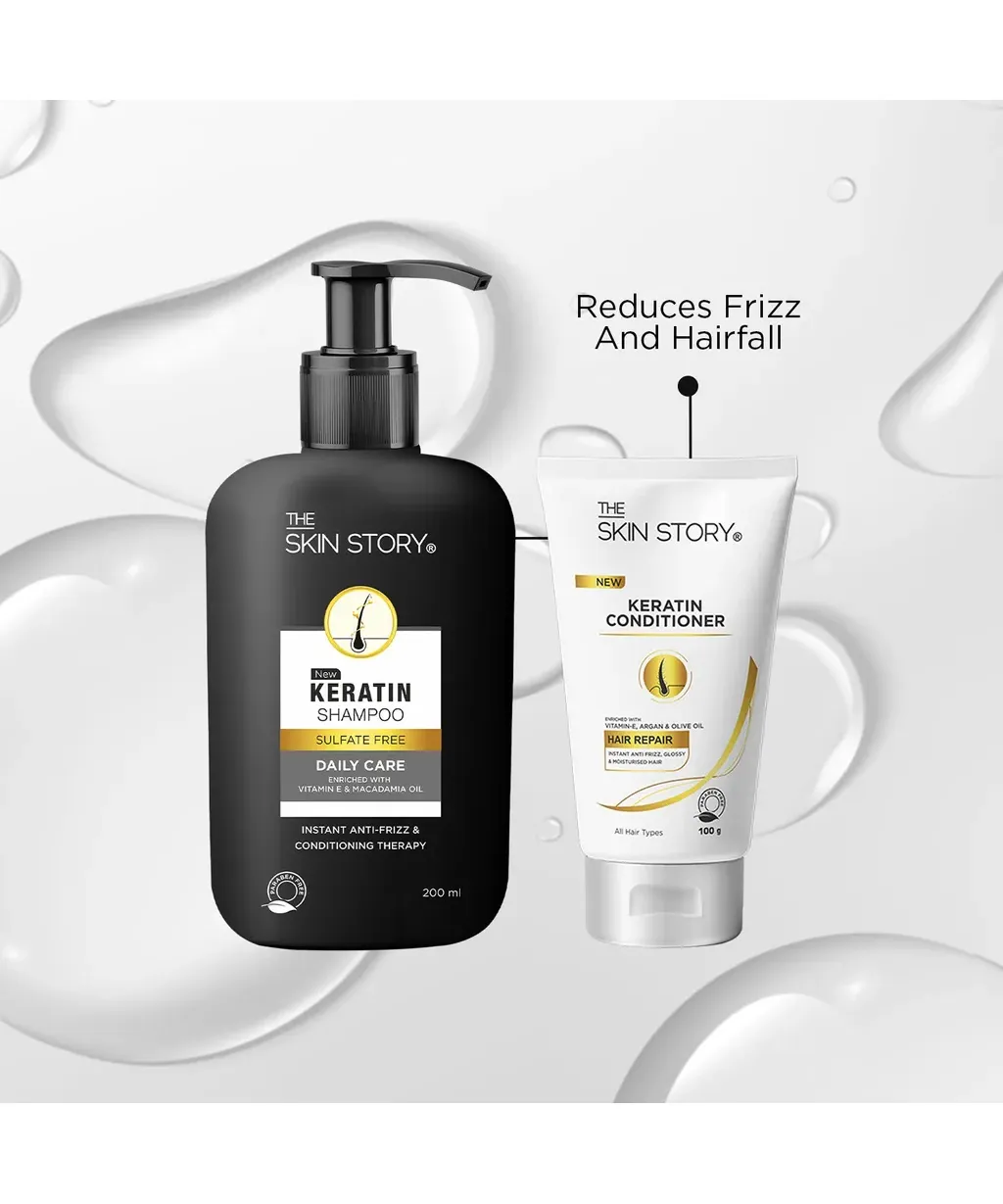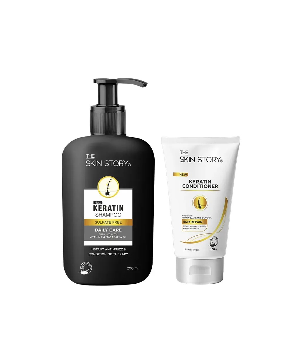 The Skin Story Sulphate & Paraben Free Keratin Hair Care Duo is a combo pack of Sulphate free Keratin Shampoo and Keratin Conditioner which is a powerful pair. Packed with moisture, nutrients, and all-natural and safe ingredients, this combo will make your hair look smoother, stronger, and shinier instantly. Keratin, being the key ingredient, will allow hair to retain moisture making it visibly bouncy, stronger, and healthy.