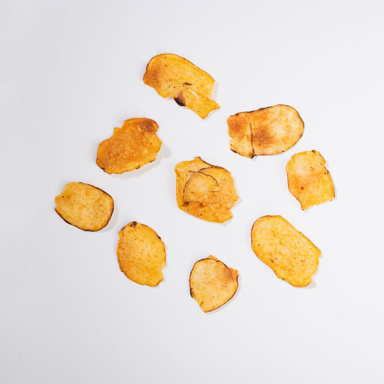 Almost Oil Free : Vegetables roasted in natural sun light are sprinkled with herbs using less than 0.1% (2-3 ml for every 1 kg of chips) of virgin olive oil cooked at room temperature.