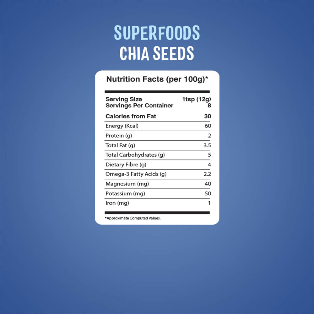Timios Everyday Superfoods, Chia Seeds is a complimentary food for all ages above 2+ years. Chia Seeds among the healthiest foods on planet. They are loaded with nutrients that have important benefits for body and brain. Apart from having higher anti-oxidants than blueberries, . Timios Everyday Superfoods Chia seeds are 100% organic, rich in ALA (Alpha-Linolenic Acid) Omega 3 Fatty Acids, fibre and other nutrients. Chia seeds can be used in daily diet for a healthy lifestyle. Important note: Not intended to use by pregnant or lactating woman. If on medication, consult your doctor before consuming it. Not for medicinal use.