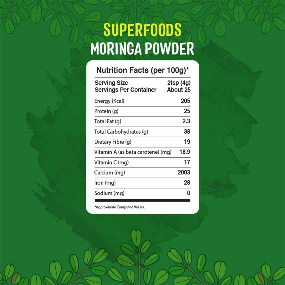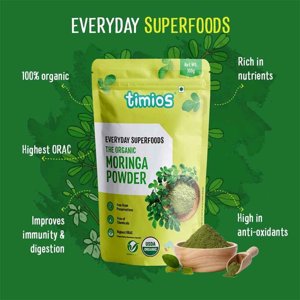 Timios Everyday Superfoods, Moringa powder is a complementary food for anyone above 12+ years. Moringa oleifera is a plant that is often called the drumstick tree, the miracle tree. Moringa has been used for centuries due to its medicinal properties and health benefits. Timios everyday superfoods Moringa Powder is 100% organic and retains its properties of antifungal, antiviral, antidepressant, and anti-inflammatory properties. Its highest ORAC (Oxygen Radical Absorbance Capacity) supports bone density and proper electrolyte balance. Moringa powder can be used in daily diet for healthy lifestyle. Important note: Not intended to use by pregnant or lactating woman. If on medication, consult your doctor before consuming it. Not for medicinal use.