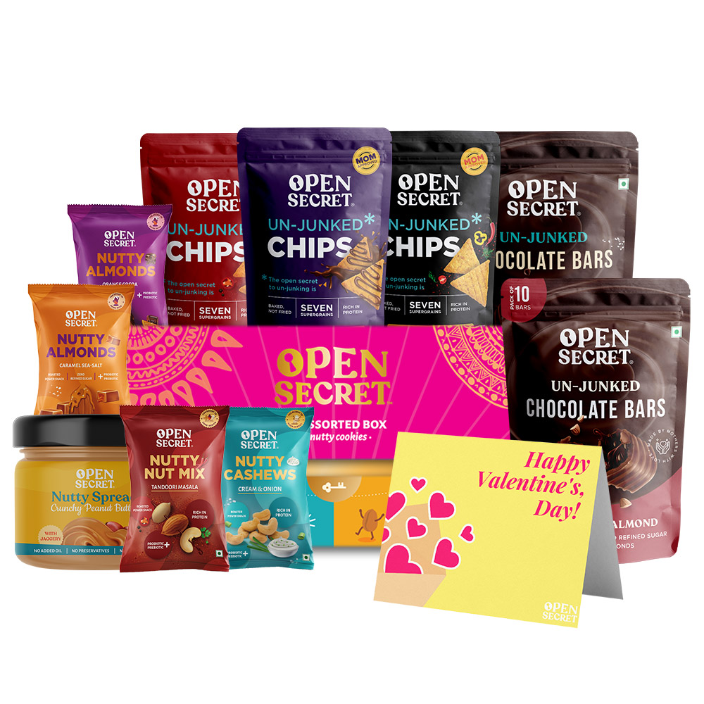 Open Secret Valentine Gift Hamper | 12 Assorted Cookies | 2 Chocolates | 3 Unjunked Chips | 4 Mini Immunity Boosting Nuts | Crunchy Peanut Butter |Special Combo Pack for Boyfriend/Girlfriend with Card