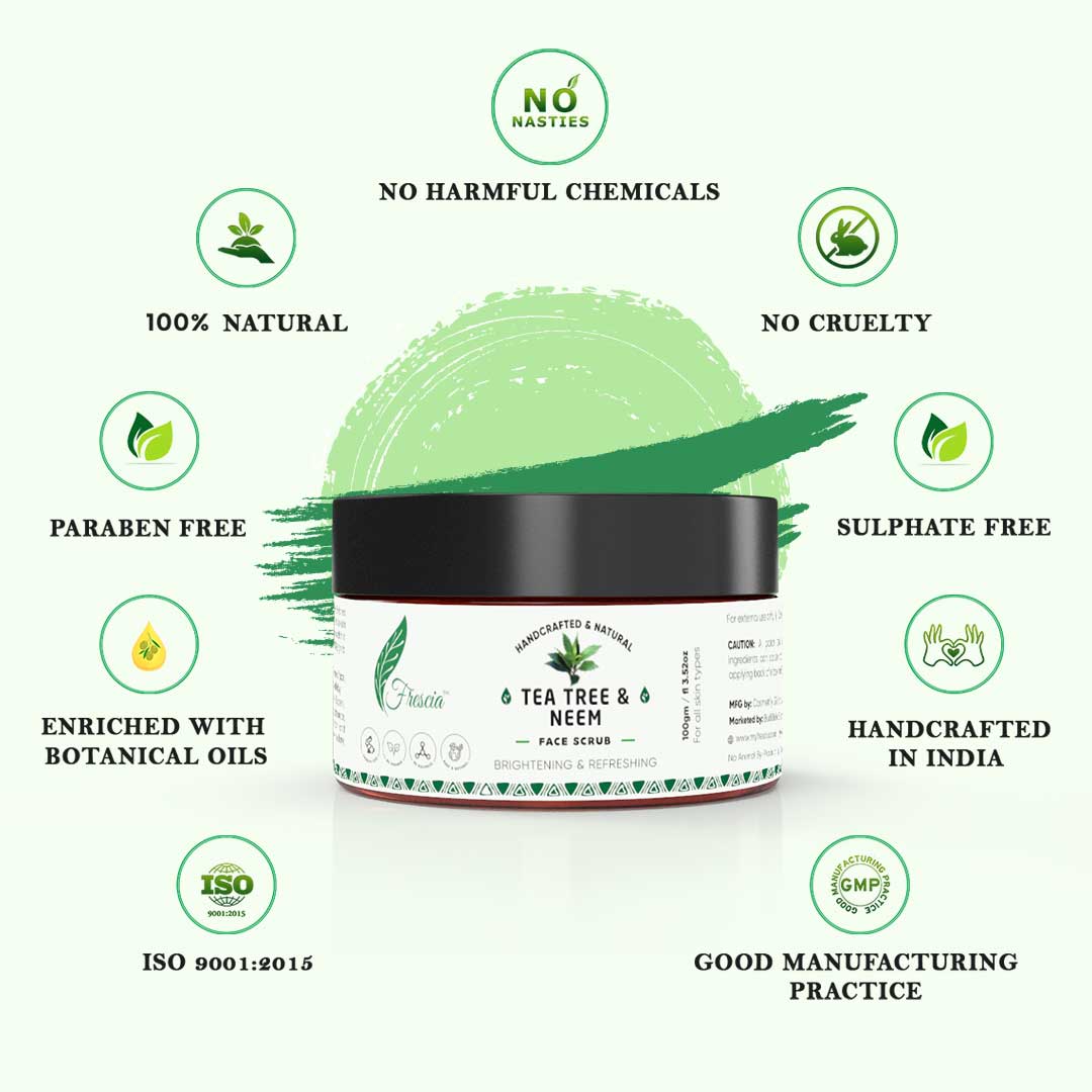 This product is the perfect solution for treating acne and blackheads. While ingredient like neem lightens dark spots, provides healthy glow and unclogs your pores, the active components of tea tree combat with excess sebum and treats your acne leaving you with fresh, clean and acne-free skin. It is a daily facial exfoliator which is perfect for dealing with blemished skin. It provides your skin a perfect soothness. The infusion brightens up skin tone, rejuvenates your skin and makes your skin healthy. Along with slowing the process of ageing of the skin, it provides you with the shining and glowing effect on the skin after a few weeks.