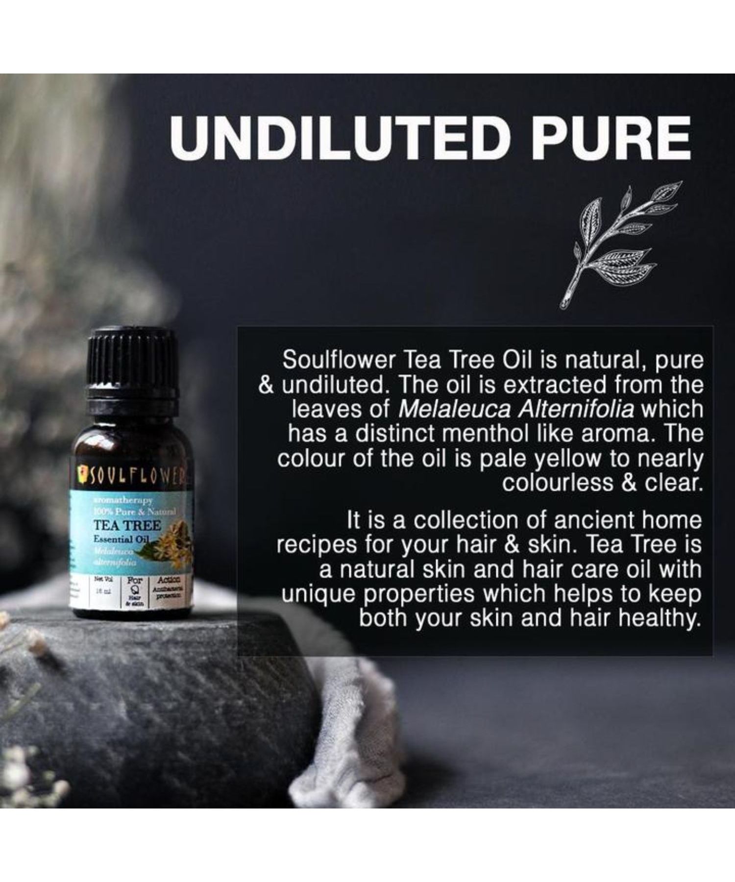 Mix Soulflower Tea Tree Essential Oil with any Soulflower carrier oil before applying on hair & skin. Massage gently.