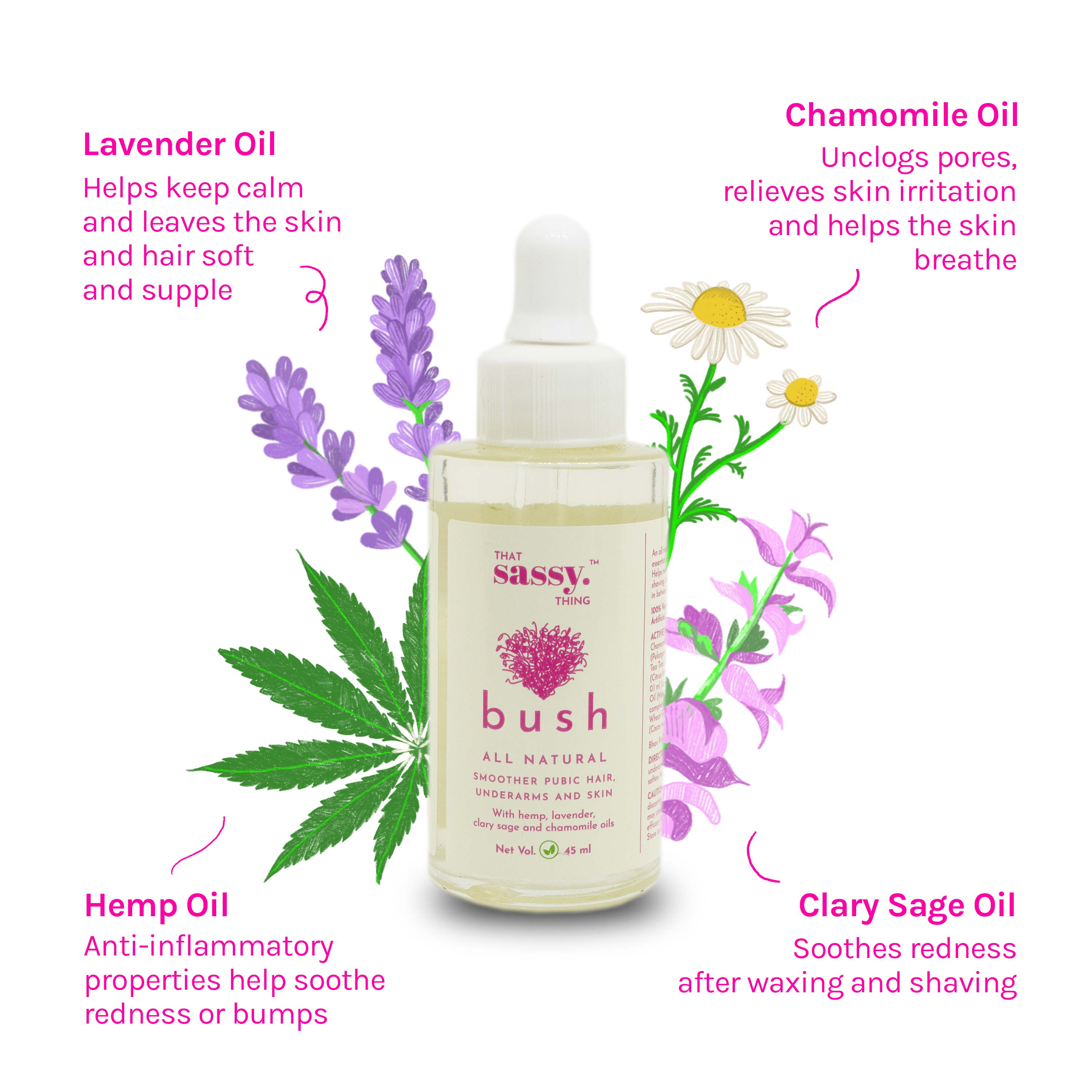 An all natural, dermatologically tested safe, blend of hemp oil and essential oils to soften and smoothen the pubic hair and skin and ease redness and bumps post waxing, trimming and shaving. It is nutrient-dense, super light, multi-purpose oil that softens and nourishes all skin and hairon your legs, pubic, underarms, face, head (and everywhere in between). Toodles inflamed, dry, bumpy skin (post trim, wax and shave) and frizzy, tangled pubes!