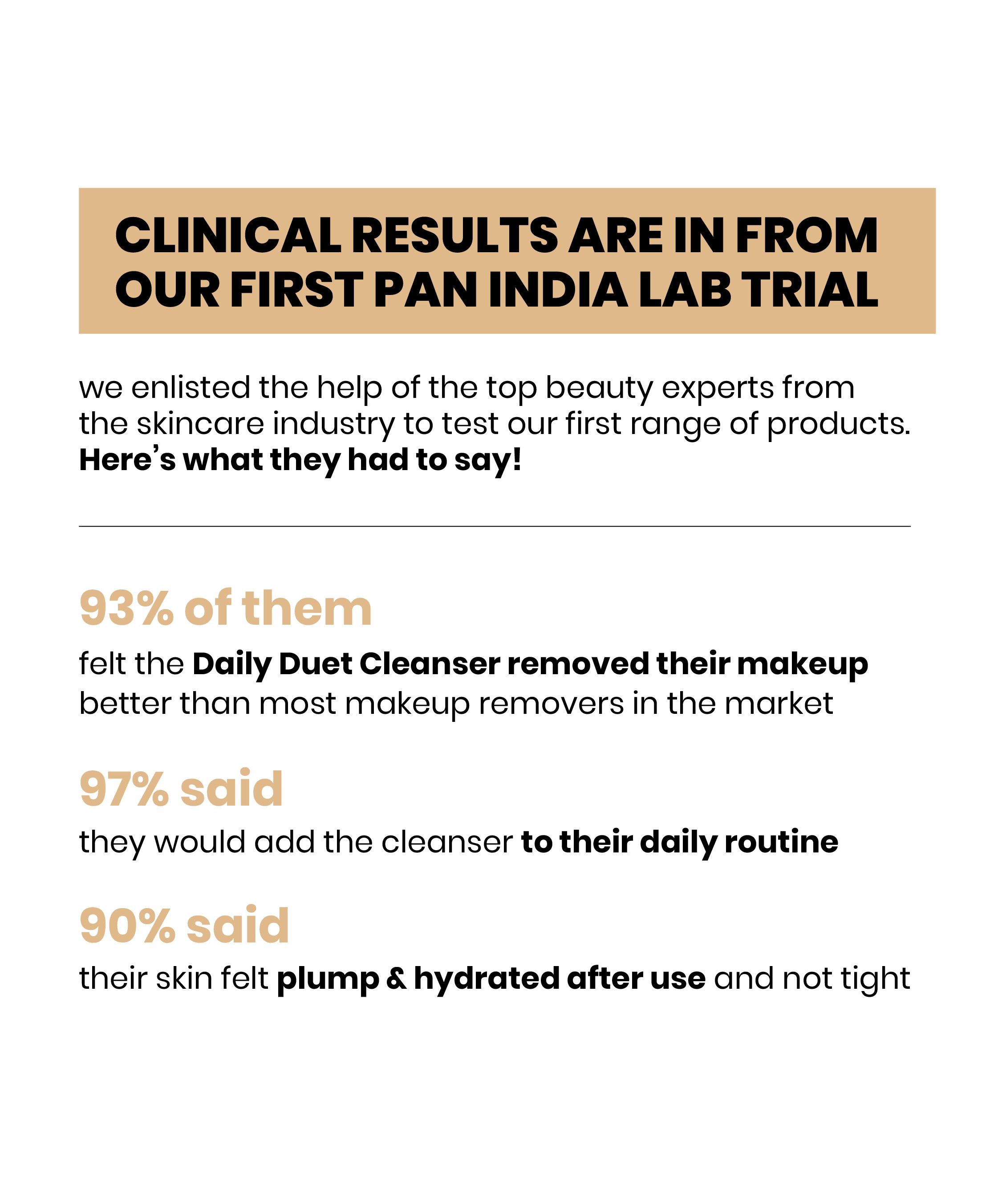 We created a cleanser that not only cleans the skin of any pollutants, but also fights free radicals and sun damage caused throughout the day. Most importantly, a cleanser that restores natural levels of oil and moisture through ample hydration.In addition to these, it is also a makeup remover. The thought of the long process of removing makeup properly should not stop any one from applying it and as working women we know what a saviour a good makeup remover is. Hence, we were certain that our cleanser should be able to easily, quickly and efficiently remove all traces of makeup at the end of a long day without making the skin dry and irritable.
