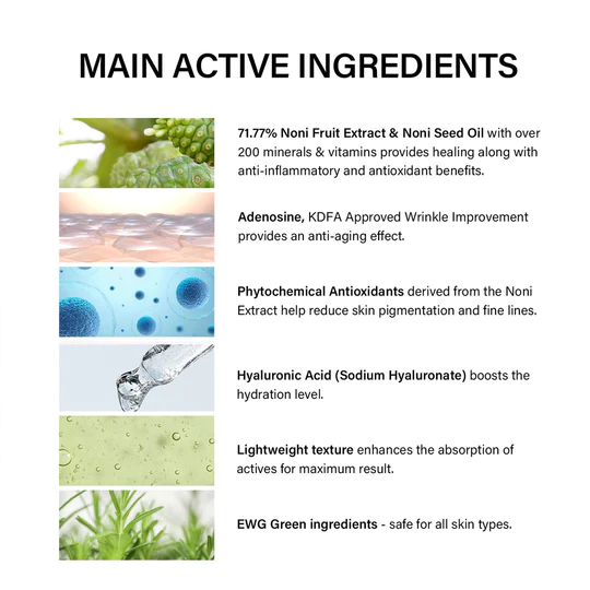 Infused with ultra-nourishing 71.77% Noni extract with over 200 nutrients that provide intense hydration to the skin. Antioxidants derived from Noni supports skins natural synchronization that gives a glowy, flawless complexion. Filled with ingredients that enhance aging skin by reducing fine wrinkles and soothes irritated skin. Its lightweight texture boosts the absorption of nutrients & vitamins making it more effective to achieve plump skin.