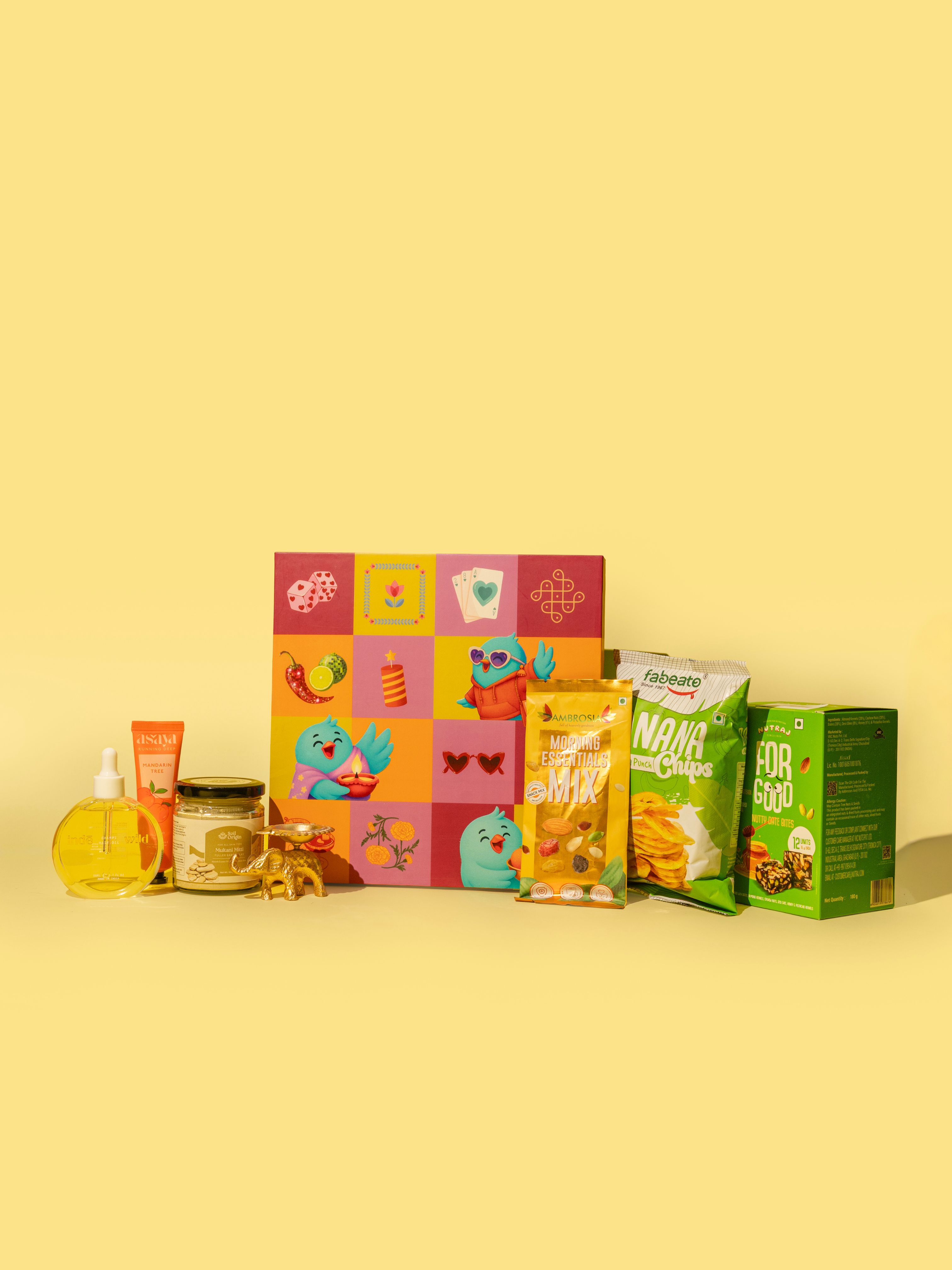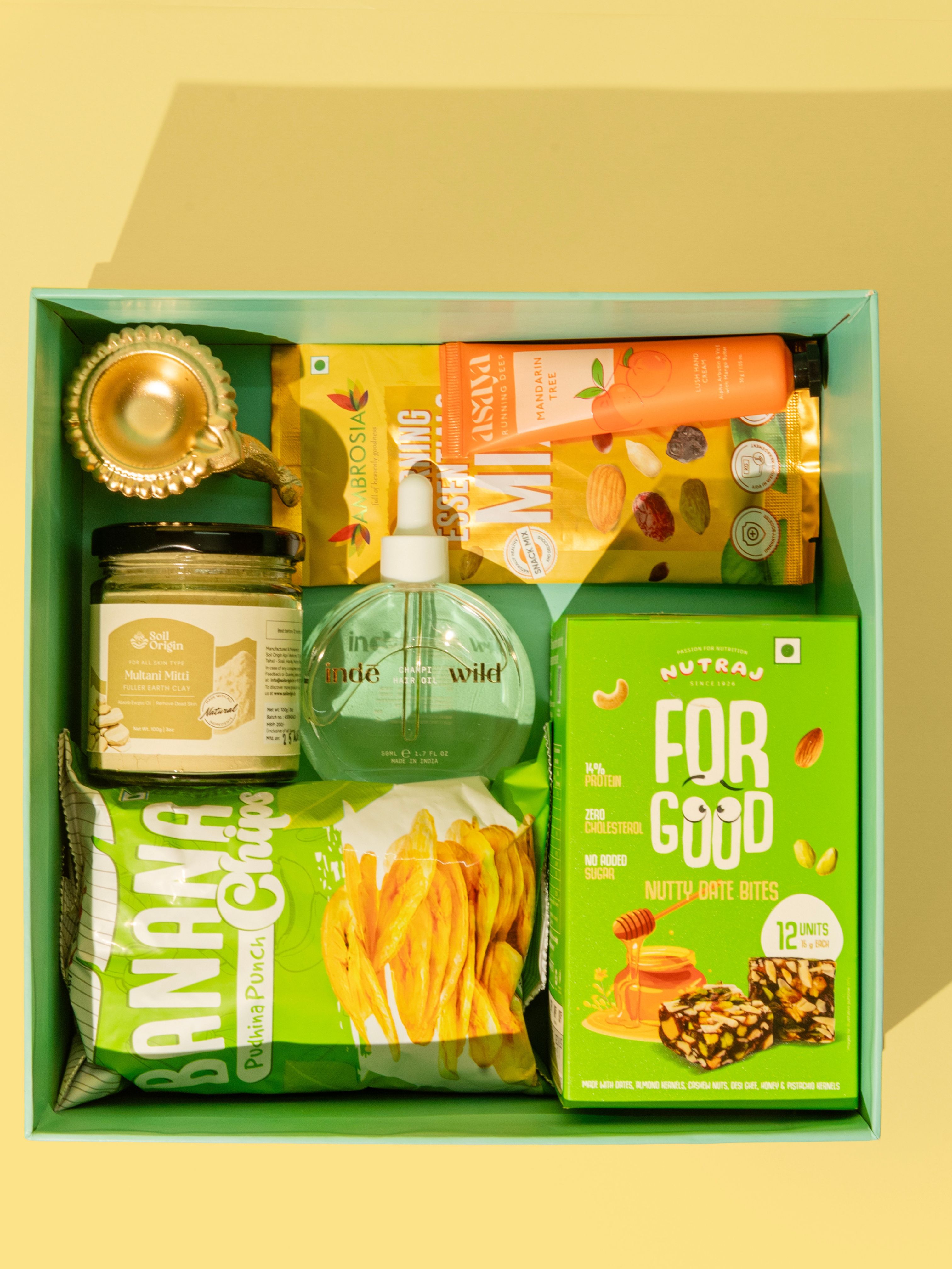 Think timeless rituals with a modern twist. The Riwaaz Box is your festive starter pack that blends all things old-school (like champi oil and mitti masks) with new-school luxe (mandarin hand cream, chic trail mixes, and wholesome bites).