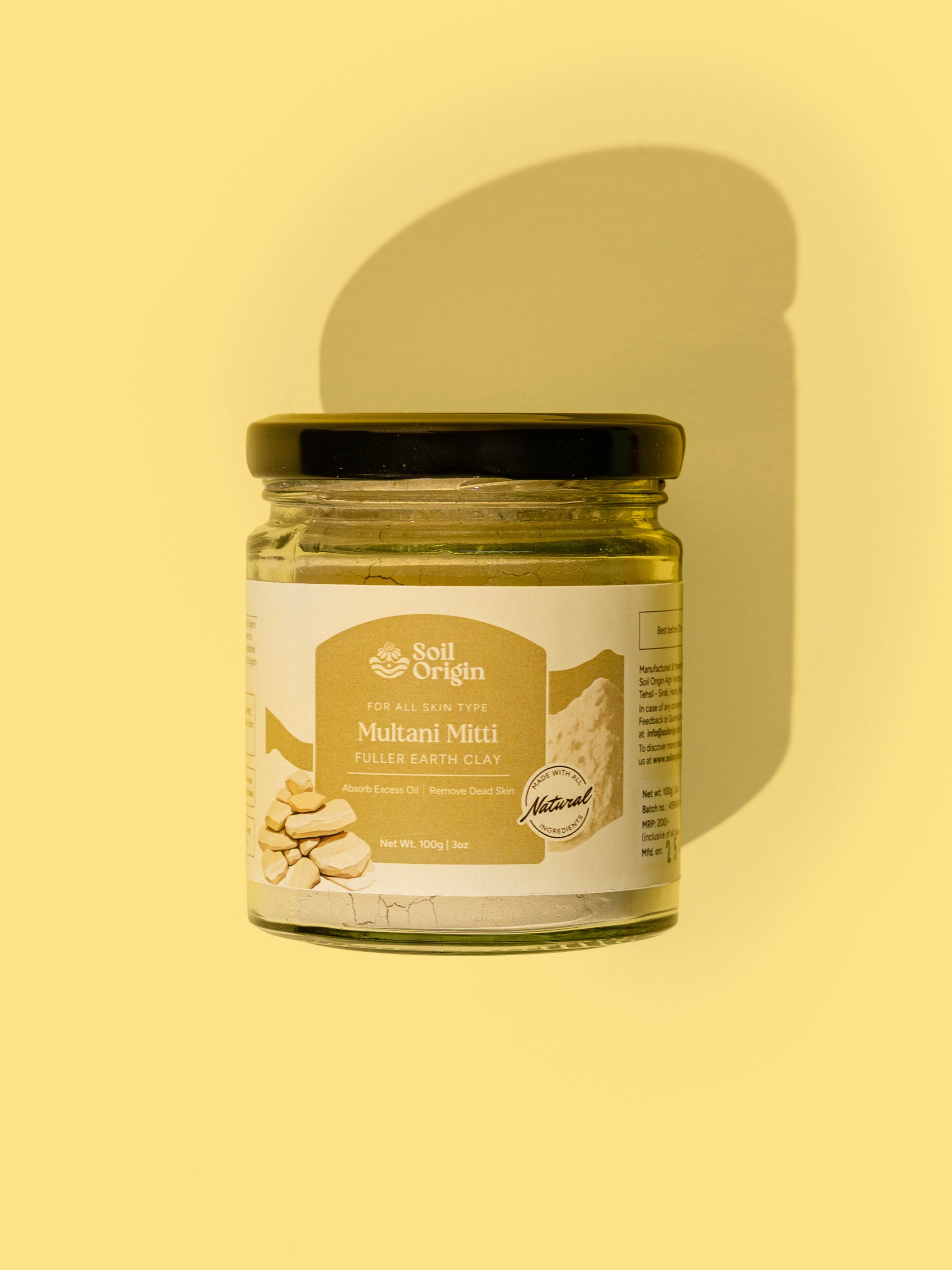 Soil Origins Multani Mitti – Mix with rose water/aloe, apply on face, rinse after 10–15 mins.