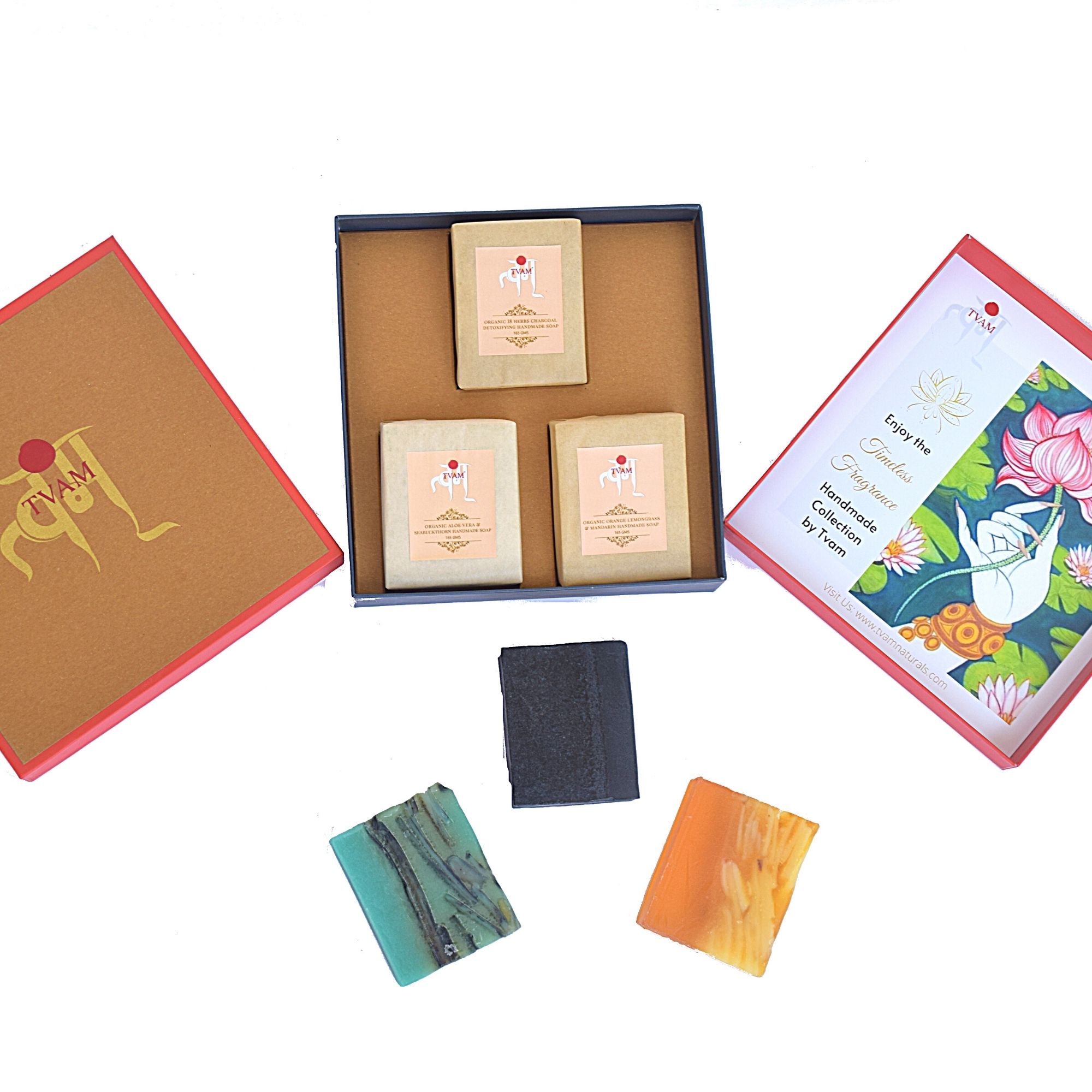Refreshing handmade soap with Citrus Aroma which controls Oil sebum, moisturize skin and brightens skin.Refreshing aroma of cologne to kick start your day, the handmade soap deeply moisturize and repair your skin. The ingredients in the soap act as a natural SPF and anti-pollutant. An Ayurvedic combination of 18 herbs Detoxifies, purifies, deep cleanses the pores, repairs the skin and heals it over a period of time while keeping the skin moisturized post use. This Box contains: Organic Orange lemongrass & Mandarin Handmade soap - 165 gms Organic Aloe Vera Sea buckthorn Handmade soap - 165 gms Organic 18 herbs charcoal detoxifying Handmade soap - 165 gms