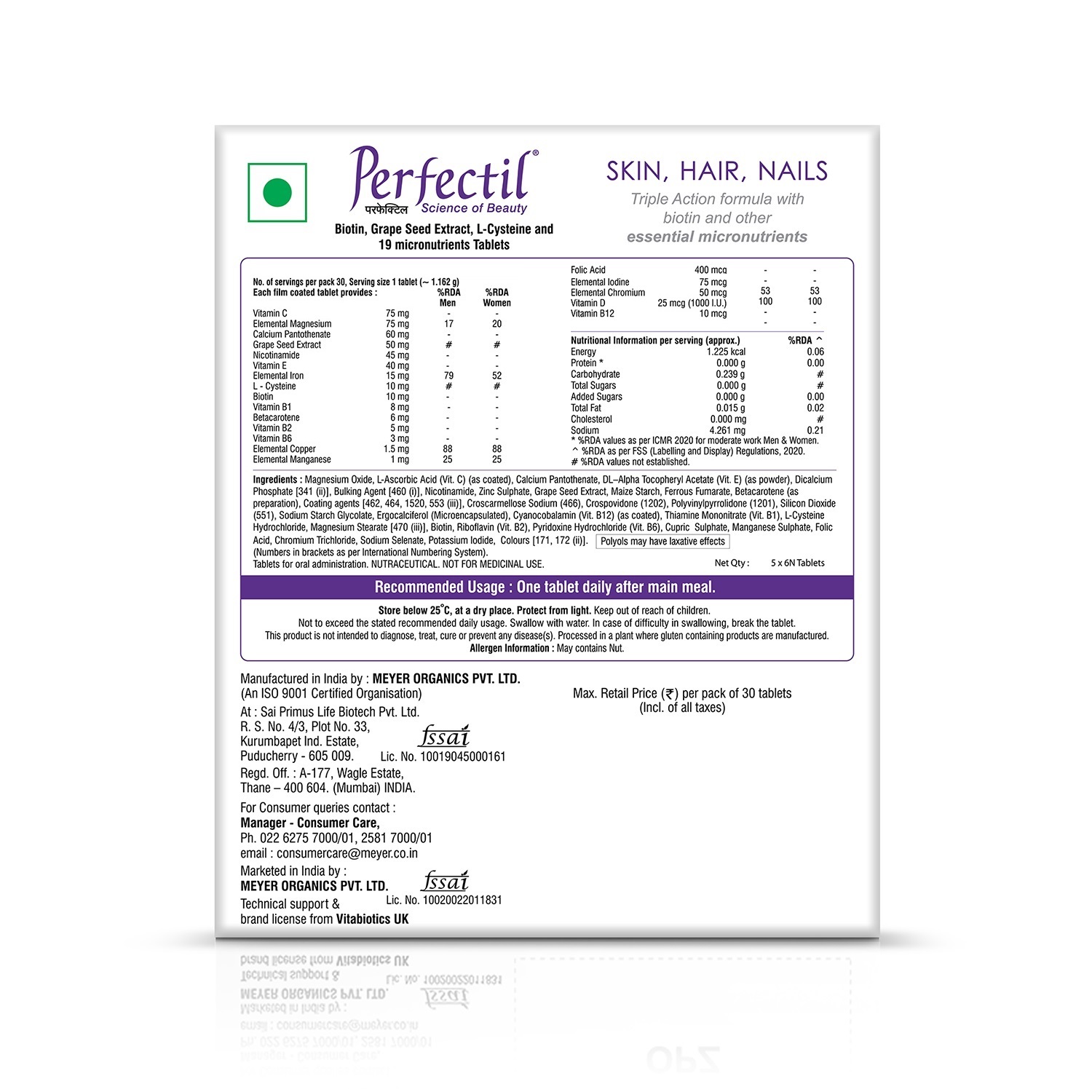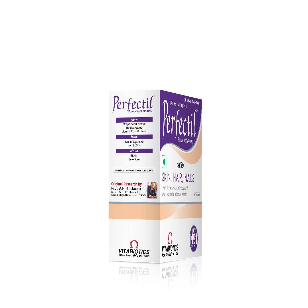 Perfectil is a multivitamin tablet that gives you the nourishment within the body where beauty begins with triple active support of biotin, zinc & selenium along with grape seed extract for perfect skin, hair and nails. Vitabiotics Perfectil is also the UKs No.1 beauty supplement brand from the best multivitamin company that is now available in INDIA.