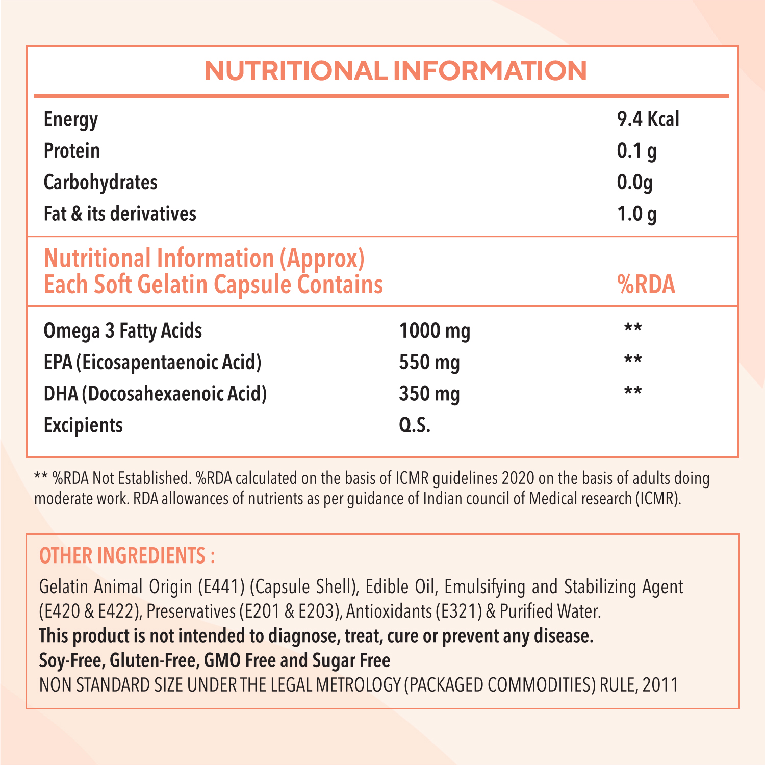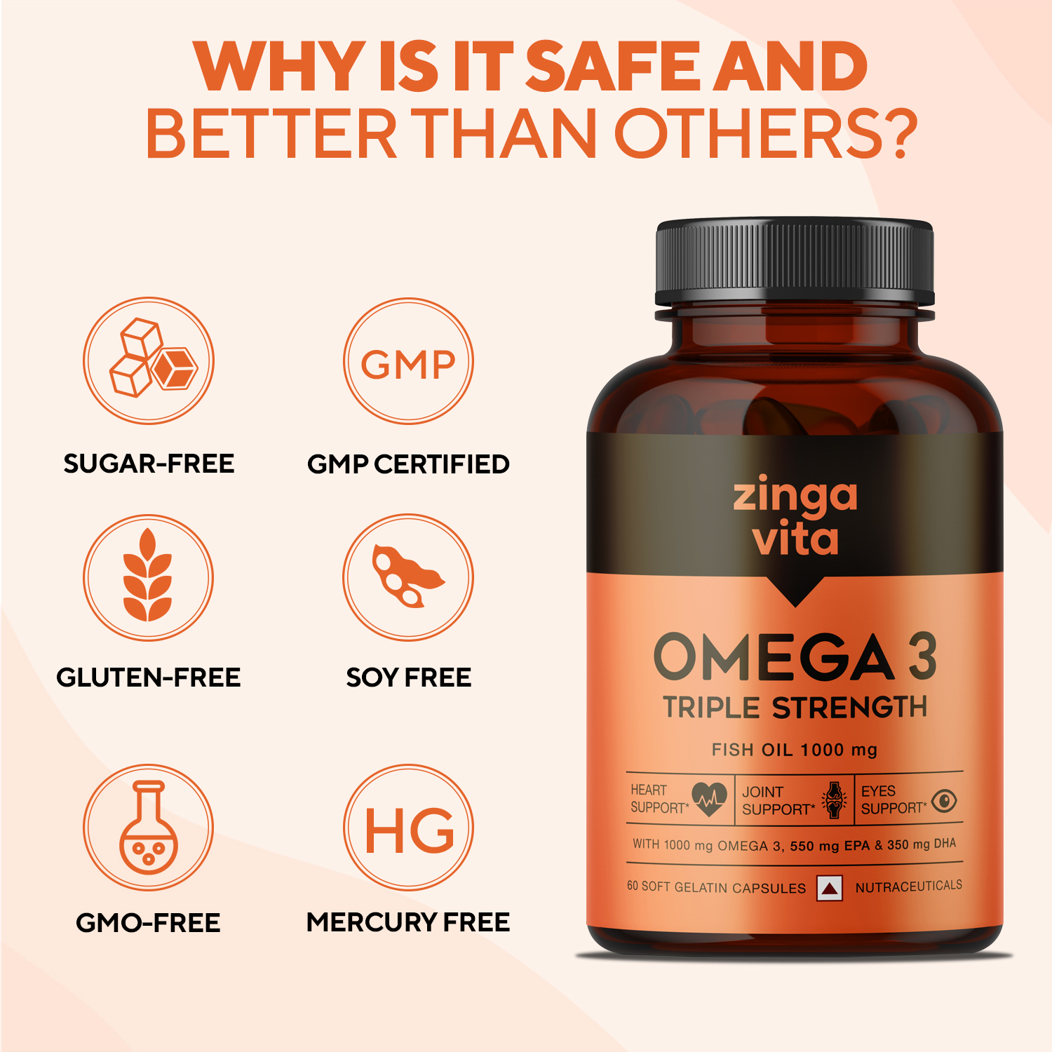 Scientifically Formulated Omega 3 To Keep You Worry-Free: You Work So Hard For Everything To Be Perfect, But Sometimes Your Food Habits Fall Short Of Perfect. WeVe Got Something For You To Bridge This Gap. Say Hello To Our Ultra Pure Triple Strength Omega 3 Fish Oil Supplement. The Ideal Combination Of 1000Mg Omega 3, 550 Mg Epa And 350 Mg Dha To Help Support The Brain, The Heart And The Eyes.3X More Omega-3 Fish Oil Per Capsule: Our Ultra-Pure Refined Fish Oil Omega 3 Is Extracted From Deep Sea Wild Fish For Enhanced Absorption And Superior Bioavailability. It Will Truly Make You Go Omg!