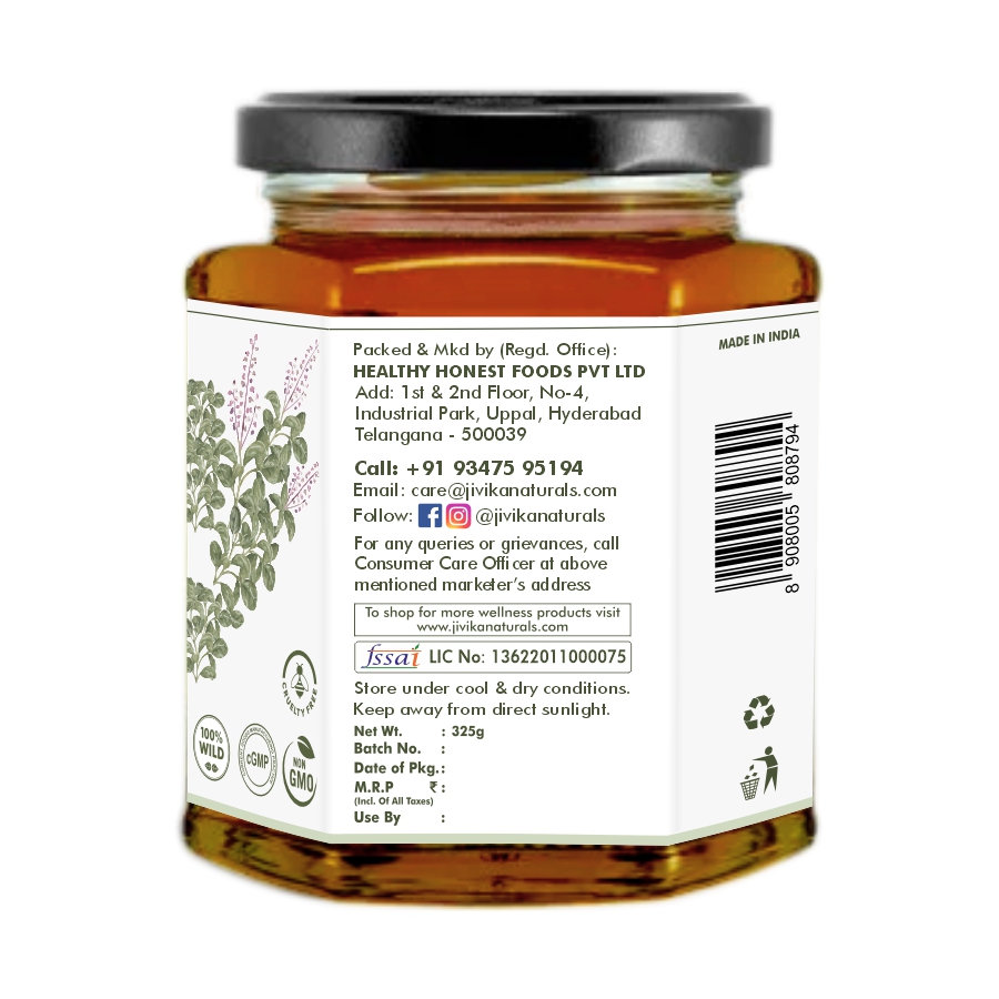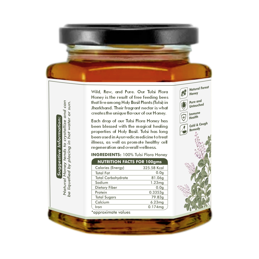 Wild, Raw, and Pure. Our Tulsi Flora Honey is the result of free feeding bees that live among Holy Basil Plants (Tulsi) in Jharkhand. Their fragrant nectar is what creates the unique flavour of our Honey. Each drop of our Tulsi Flora Honey has been blessed with the magical healing properties of Holy Basil. Tulsi has long been used in Ayurvedic medicine to treat illness, as well as promote healthy cell regeneration and overall wellness.