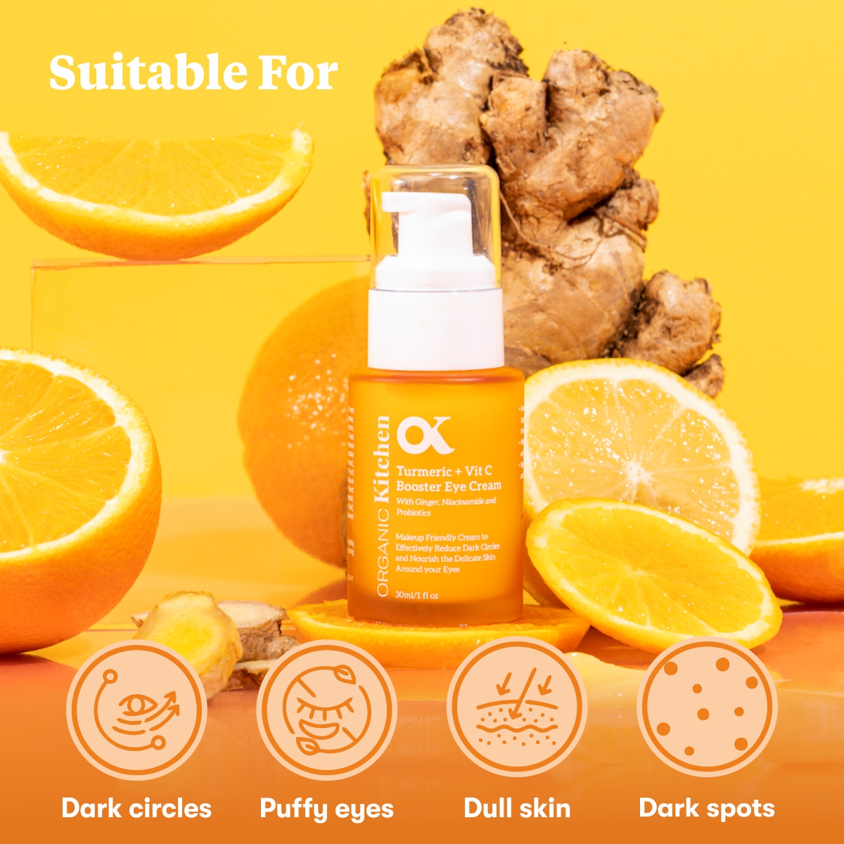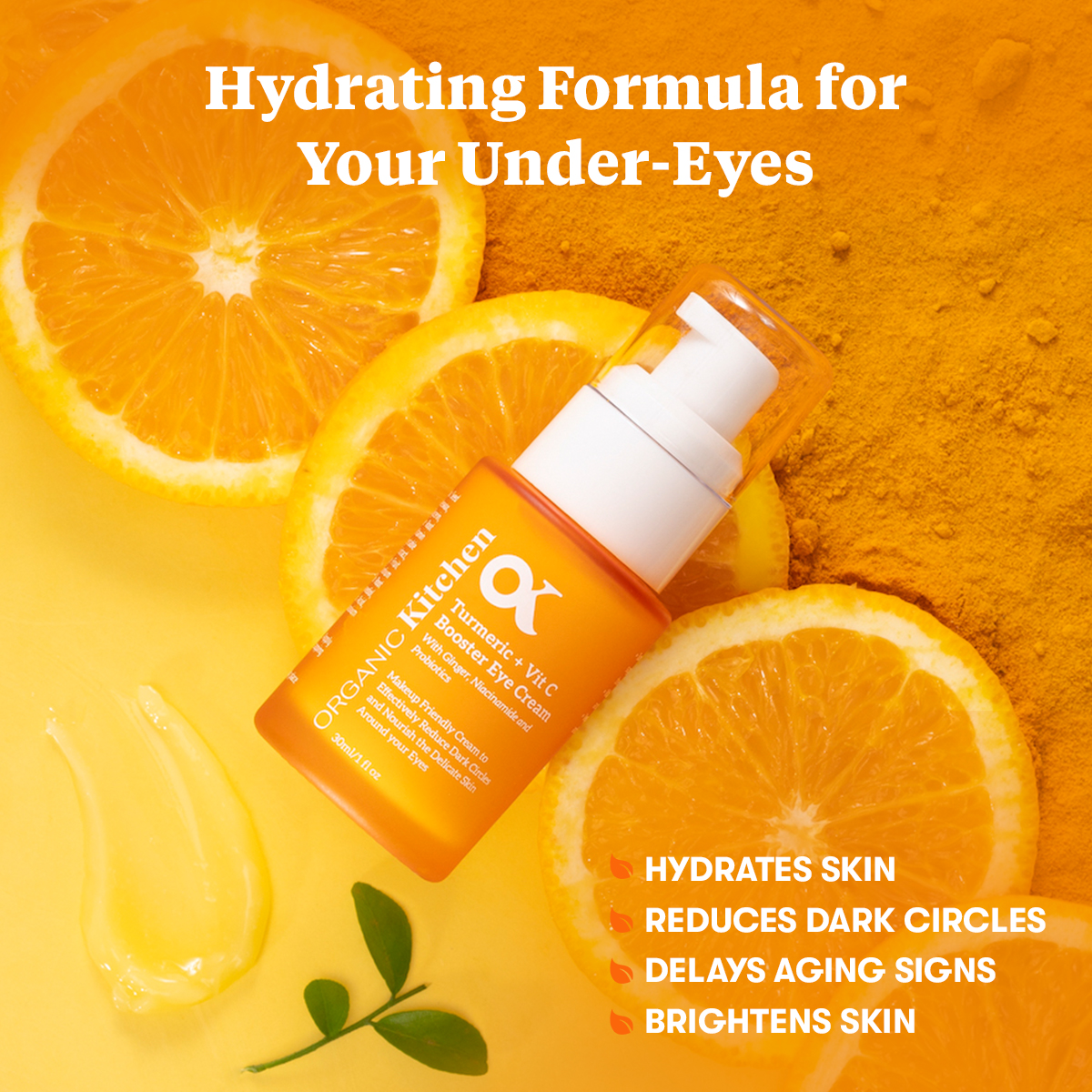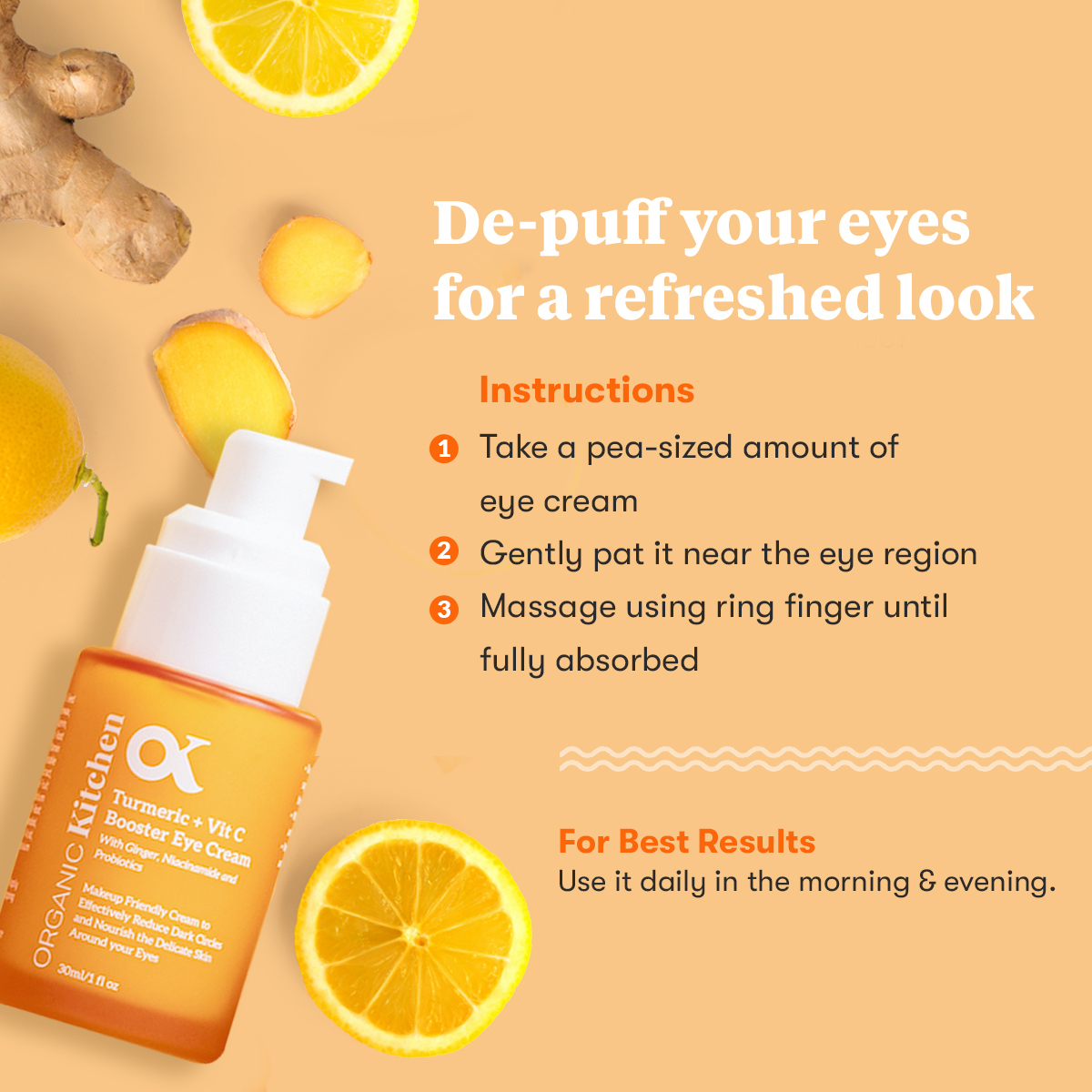 Take care of your eyes and say goodbye to dark circles and puffy eyes with this Turmeric + Vitamin C Booster Eye Cream. Enriched with the goodness of Turmeric, Vitamin C and Vegetable Collagen, this eye cream visibly brightens and smoothens under eyes by minimizing dark circles and under-eye bags. Antioxidant-rich turmeric helps in reducing wrinkles and puffiness of the eyes, while Vitamin C provides constant hydration to the dull and dried-up under eyes. Give your eyes a natural boost with this lightweight and smooth eye cream.