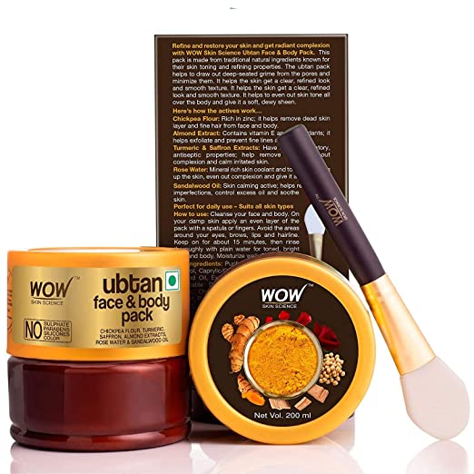 Ubtan - the beauty secret of the queens, courtesans, ladies and brides of yore is a paste made with herbs, oils, natural powders and extracts. Ubtans are traditional ayurvedic beauty and wellness recipes meant to rejuvenate skin, body and mind. In the olden days, applying Ubtan was ritualistic. Refine and restore your tired, sluggish skin and get radiant complexion with wow skin science Ubtan face & body pack. This pack is made from traditional natural ingredients known for their skin toning and refining properties. The Ubtan pack helps to draw out deep-seated grime from the pores and minimize them. It helps the skin get a clear, refined look and smooth texture. The pack has almond extract, which contains vitamin e and that moisturizes and prevents fine lines and dryness. Rose water is mineral rich skin coolant and toner that firms up the skin, evens out complexion, giving skin a soft glow. Chickpea flour is a natural exfoliate that aids in removing dead skin layer and fine hair from face. The face and body pack aids in firming and moisturizing skin. The pack provides protection to skin from damage. It supports in removing skin imperfections, control excess oil and soothe skin. Suitable for all skin types, this face wash can be used to restore skins natural radiance and suppleness.