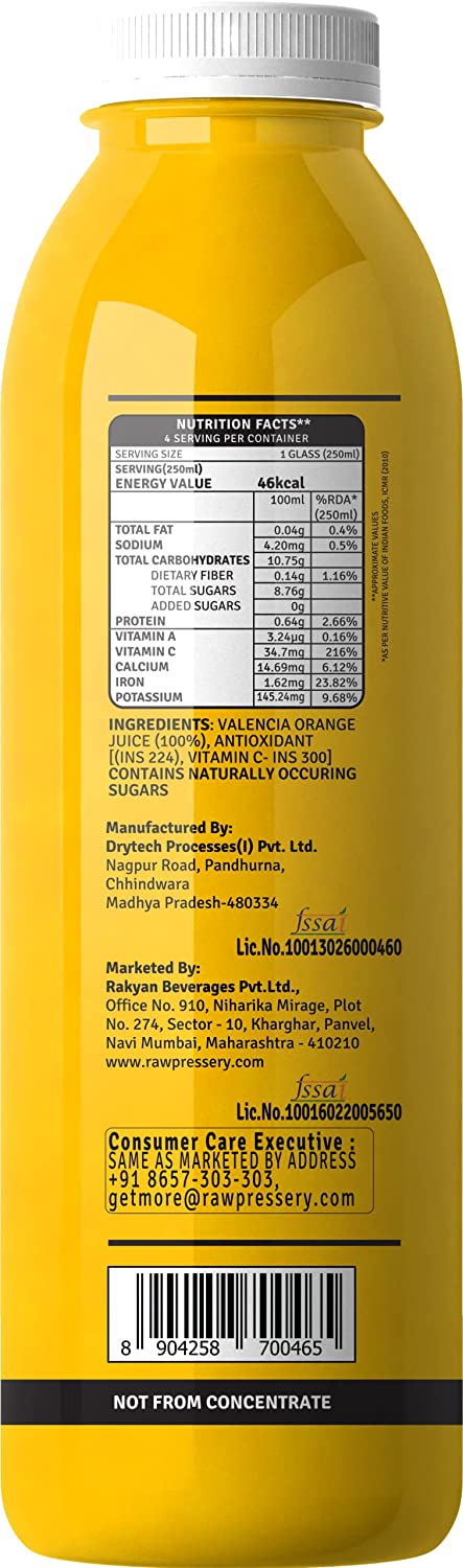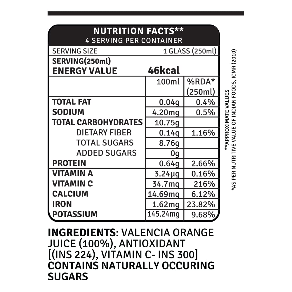 Get a sunshine start to your day with freshly squeezed Valencia Oranges, loaded with dietary fibres and vitamin C.This fruit juice is the best cold drink you can have! This bottle helps you to boost your immunity, protects skin, improves bowel movement.Store in cool, dry and hygienic place away from directsunlight.Named after a city in Spain, Valencia Oranges have 92% of the daily recommended amount of the Vitamin C