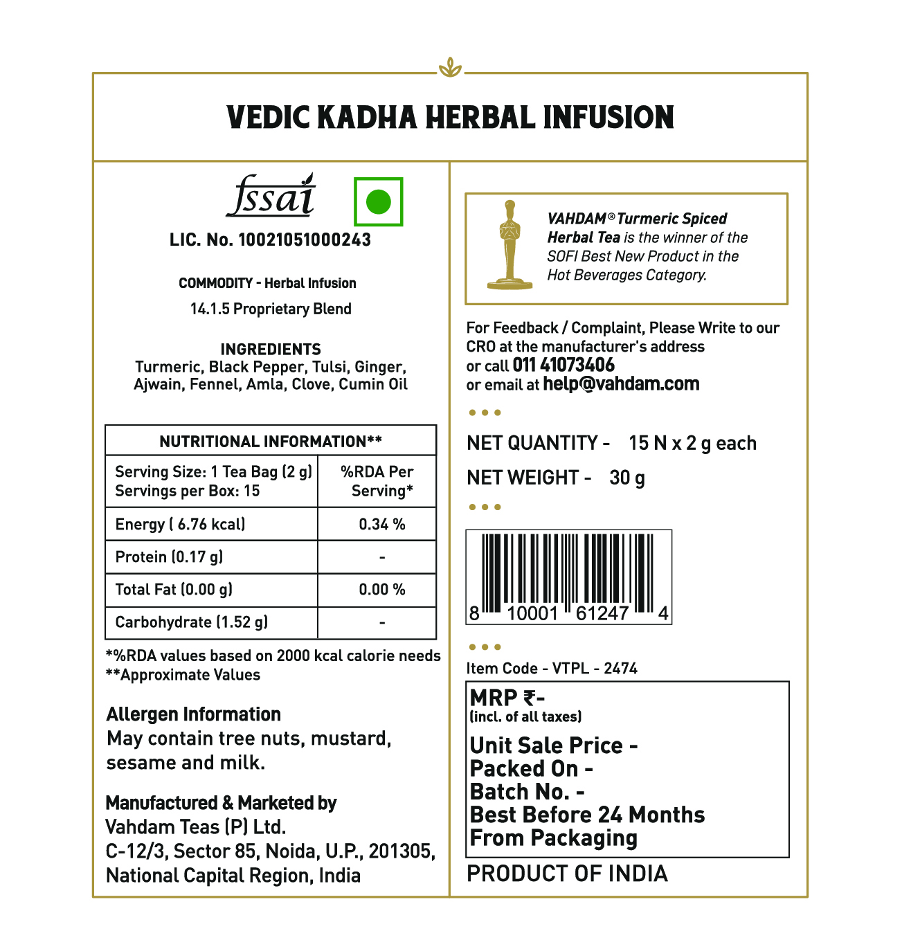 This product is a ingenious blend of ayurvedic superfoods with health benefits of turmeric and other ingredients. It is a caffeine-free herbal blend with no artificial additives.